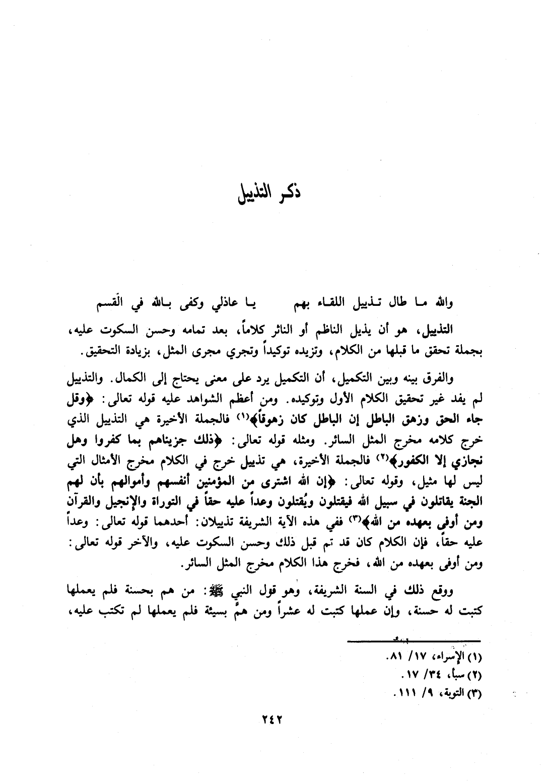 والفرق بينه وبين التكميل، أن التكميل يرد على معنى يحتاج إلى الكمال. والتذييل لم يفد غير تحقيق الكلام الأول وتوكيده. ومن أعظم الشواهد عليه قوله تعالى: {وَقُلْ جَاءَ الْحَقُّ وَزَهَقَ الْبَاطِلُ إِنَّ الْبَاطِلَ كَانَ زَهُوقًا} 1 فالجملة الأخيرة هي التذييل الذي خرج كلامه مخرج المثل السائر. ومثله قوله تعالى: {ذَلِكَ جَزَيْنَاهُمْ بِمَا كَفَرُوا وَهَلْ نُجَازِي إِلَّا الْكَفُورَ} 2 فالجملة الأخيرة، هي تذييل خرج في الكلام مخرج الأمثال التي ليس لها مثيل، وقوله تعالى: {إِنَّ اللَّهَ اشْتَرَى مِنَ الْمُؤْمِنِينَ أَنْفُسَهُمْ وَأَمْوَالَهُمْ بِأَنَّ لَهُمُ الْجَنَّةَ يُقَاتِلُونَ فِي سَبِيلِ اللَّهِ فَيَقْتُلُونَ وَيُقْتَلُونَ وَعْدًا عَلَيْهِ حَقًّا فِي التَّوْرَاةِ وَالْإِنْجِيلِ وَالْقُرْآنِ وَمَنْ أَوْفَى بِعَهْدِهِ مِنَ اللَّهِ} 3 ففي هذه الآية الشريفة تذييلان: أحدهما قوله تعالى: {وَعْدًا عَلَيْهِ حَقًّا} ، فإن الكلام كان قد تم قبل ذلك وحسن السكوت عليه، والآخر قوله تعالى: {وَمَنْ أَوْفَى بِعَهْدِهِ مِنَ اللَّهِ} فخرج الكلام مخرج المثل السائر.