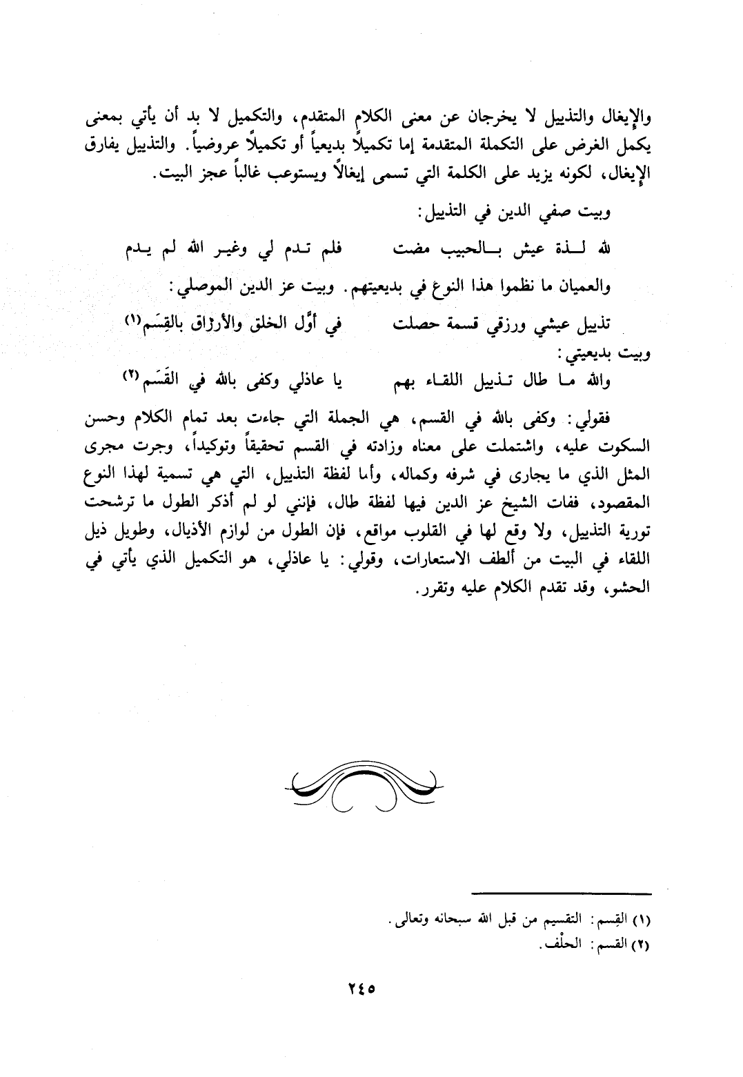 فقولي: وكفى بالله في القسم، هي الجملة التي جاءت بعد تمام الكلام وحسن السكوت عليه، واشتملت على معناه وزادته في القسم تحقيقًا وتوكيدًا، وجرت مجرى المثل الذي ما يجارى في شرفه وكماله، وأما لفظة التذييل، التي هي تسمية لهذا النوع المقصود، ففات الشيخ عز الدين فيها لفظة طال، فإنني لو لم أذكر الطول ما ترشحت تورية التذييل، ولا وقع لها في القلوب مواقع، فإن الطول من لوازم الأذيال، وطويل ذيل اللقاء في البيت من ألطف الاستعارات، وقولي: يا عاذلي، هو التكميل الذي يأتي في الحشو، وقد تقدم الكلام عليه وتقرر.