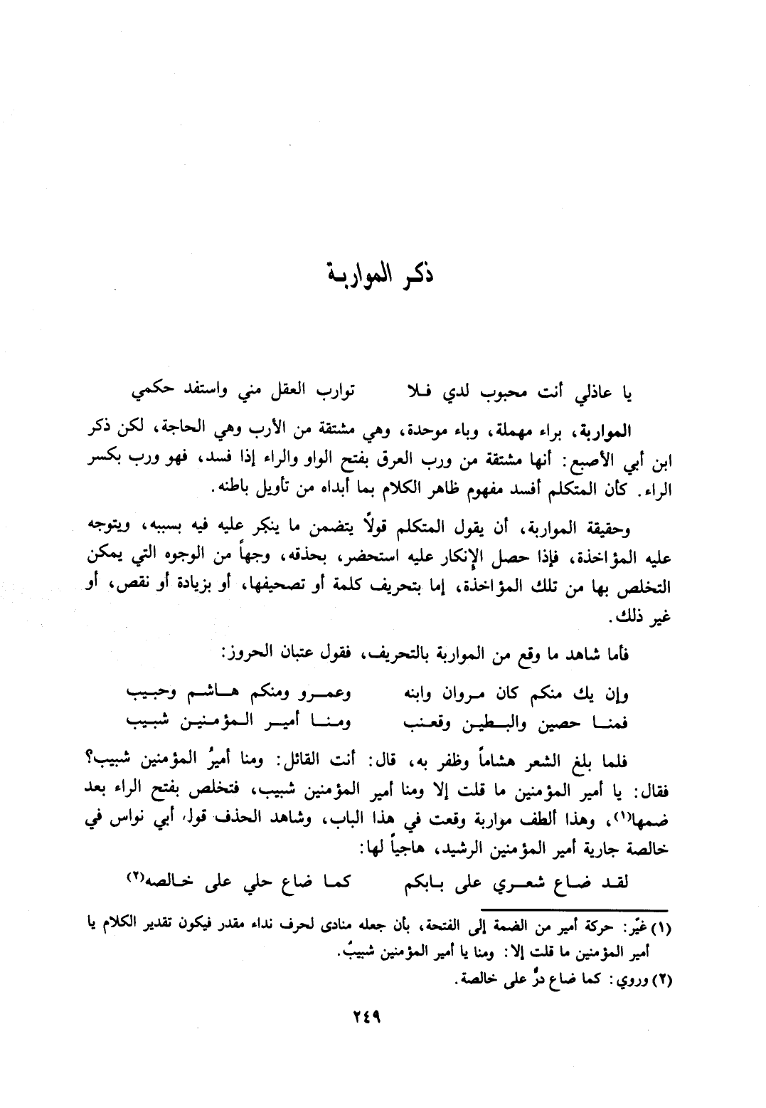 فقال: يا أمير المؤمنين، ما قلت إلا: ومنا أمير المؤمنين شبيب، فتخلص بفتح الراء بعد ضمها1، وهذا ألطف مواربة وقعت في هذا الباب، وشاهد الحذف قول أبي نواس في خالصة جارية أمير المؤمنين الرشيد، هاجيًا لها: