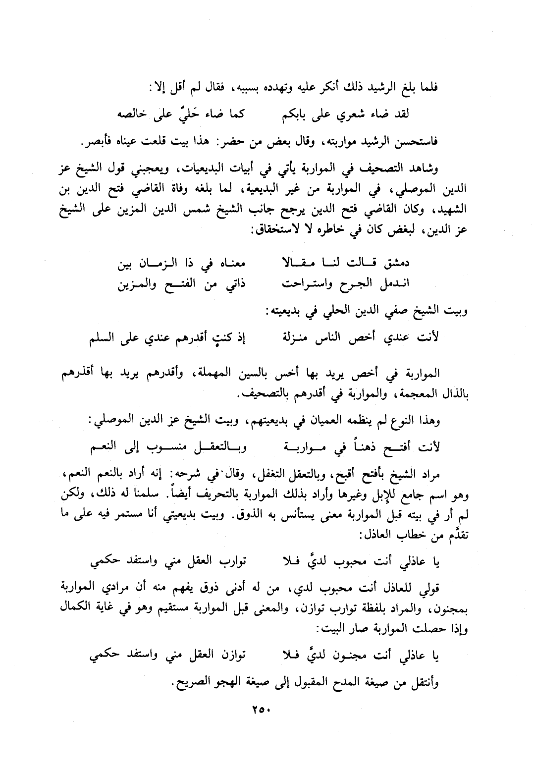 وشاهد التصحيف في المواربة يأتي في أبيات البديعيات، ويعجبني قول الشيخ عز الدين الموصلي، في المواربة من غير البديعية، لما بلغه وفاة القاضي فتح الدين بن الشهيد، وكان القاضي فتح الدين يرجح جانب الشيخ شمس الدين المزين على الشيخ عز الدين، لبغض كان في خاطره لا لاستحقاق: