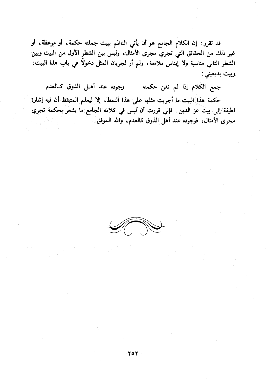 حكمة هذا البيت ما أجريت مثلها على هذا النمط إلا ليعلم المتيقظ أن فيه إشارة لطيفة إلى بيت عز الدين. فإني قررت أن ليس في كلامه الجامع ما يشعر بحكمة تجري مجرى الأمثال، فوجوده عند أهل الذوق كالعدم، والله الموفق.