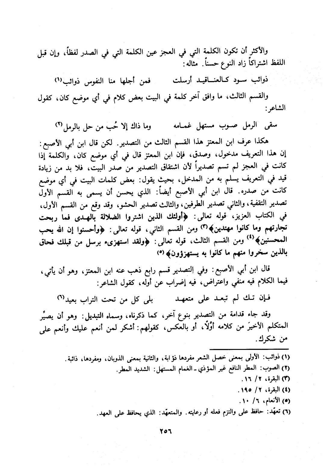 هكذا عرف ابن المعتز هذ القسم الثالث من التصدير. لكن قال ابن أبي الأصبع: إن هذا التعريف مدخول، وصدق فإن ابن المعتز قال في أي موضع كان، والكلمة إذا كانت في العجز لم تسم تصديرًا لأن اشتقاق التصدير من صدر البيت، فلا بد من زيادة قيد في التعريف يسلم به المدخل، بحيث يقول: بعض كلمات البيت في أي موضع كانت من صدره. قال ابن أبي الأصبع أيضًا: الذي يحسن أن يسمى به القسم الأول تصدير التفقيه والثاني تصدير الطرفين، والثالث تصدير الحشو، وقد وقع من القسم الأول، في الكتاب العزيز، قوله تعالى: {أُولَئِكَ الَّذِينَ اشْتَرَوُا الضَّلالَةَ بِالْهُدَى فَمَا رَبِحَتْ تِجَارَتُهُمْ وَمَا كَانُوا مُهْتَدِينَ} 3 ومن القسم الثاني، قوله تعالى: {وَأَحْسِنُوا إِنَّ اللَّهَ يُحِبُّ الْمُحْسِنِينَ} 4 ومن القسم الثالث، قوله تعالى: {وَلَقَدِ اسْتُهْزِئَ بِرُسُلٍ مِنْ قَبْلِكَ فَحَاقَ بِالَّذِينَ سَخِرُوا مِنْهُمْ مَا كَانُوا بِهِ يَسْتَهْزِئُونَ} 5