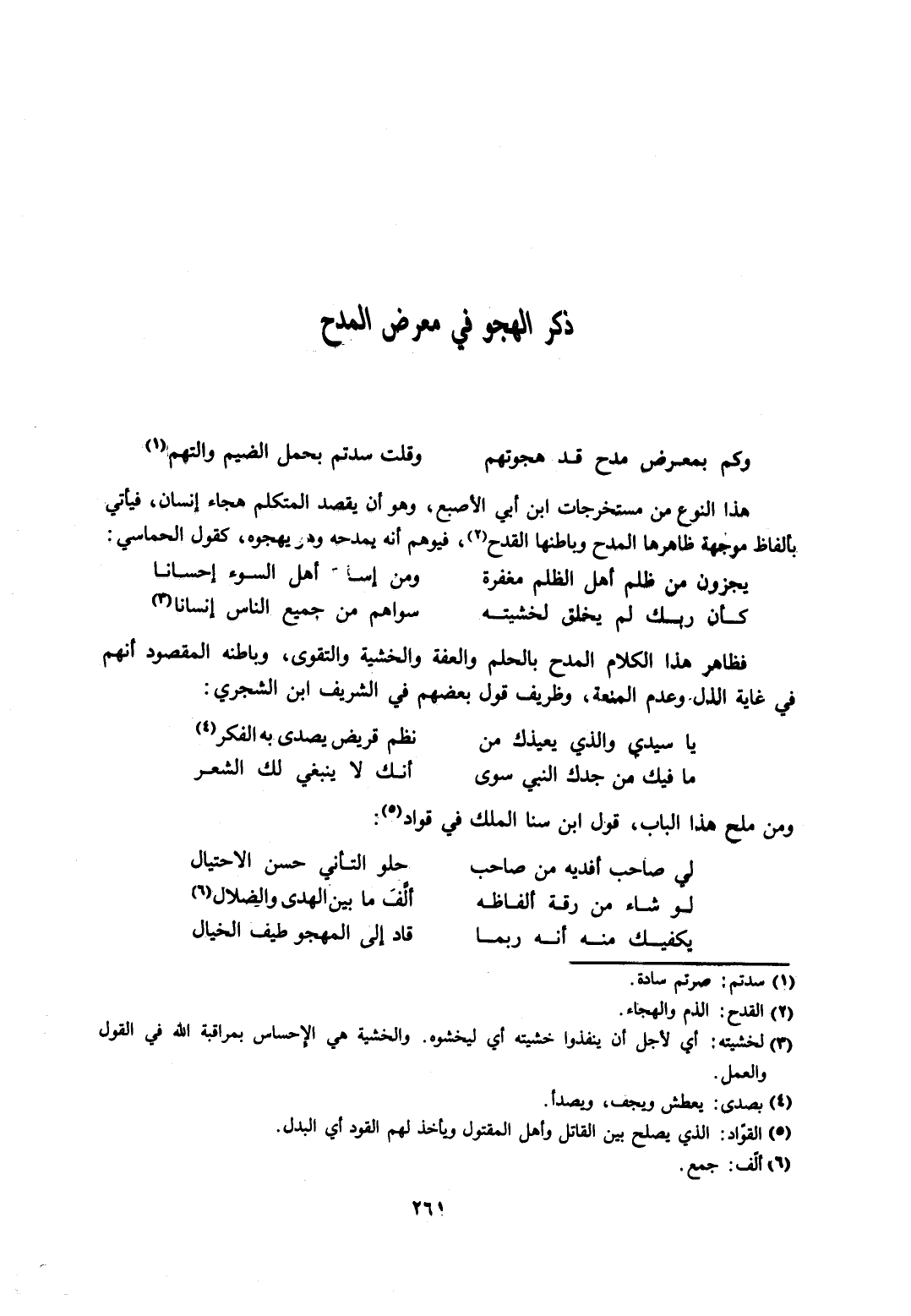هذا النوع من مستخرجات ابن أبي الأصبع، وهو أن يقصد المتكلم هجاء إنسان، فيأتي بألفاظ موجهة ظاهرها المدح وباطنها القدح2، فيوهم أنه يمدحه وهو يهجوه، كقول الحماسي: