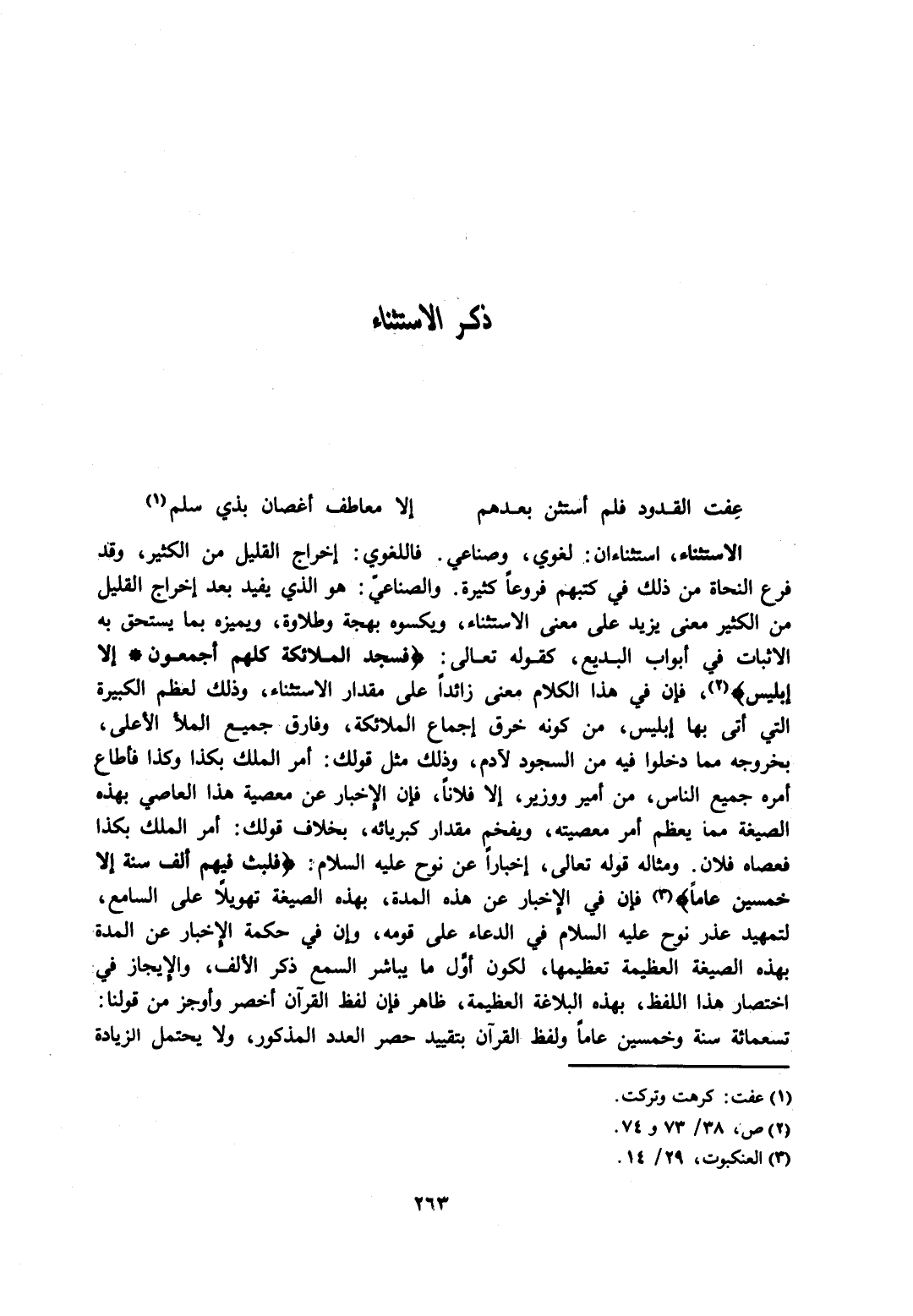 الاستثناء، استثناءان: لغوي، وصناعي. فاللغوي: إخراج القليل من الكثير، وقد فرع النحاة من ذلك في كتبهم فروعًا كثيرة. والصناعيّ: هو الذي يفيد بعد إخراج القليل من الكثير معنى يزيد على معنى الاستثناء، ويكسوه بهجة وطلاوة، ويميزه بما يستحق به الإثبات في أبواب البديع، كقوله تعالى: {فَسَجَدَ الْمَلائِكَةُ كُلُّهُمْ أَجْمَعُونَ، إِلَّا إِبْلِيسَ} 2، فإن في هذا الكلام معنا زائدًا على مقدار الاستثناء، وذلك لعظم الكبيرة التي أتى بها إبليس، من كونه خرق إجماع الملائكة، وفارق جميع الملأ الأعلى، بخروجه مما دخلوا فيه من السجود لآدم، وذلك مثل قولك: أمر الملك بكذا وكذا فأطاع أمره جميع الناس، من أمير ووزير، إلا فلانًا، فإن الإخبار عن معصية هذا العاصي بهذه الصيغة مما يعظم أمر معصيته، ويفخم مقدار كبريائه، بخلاف قولك: أمر الملك بكذا فعصاه فلان. ومثاله قوله تعالى، إخبارًا عن نوح عليه السلام: {فَلَبِثَ فِيهِمْ أَلْفَ سَنَةٍ إِلَّا خَمْسِينَ عَامًا} 3 فإن في الإخبار عن هذه المدة، بهذه الصيغة تهويلًا على السامع، لتمهيد عذر نوح عليه السلام في الدعاء على قومه، وإن في حكمة الإخبار عن المدة بهذه الصيغة العظيمة تعظيمها، لكون أول ما يباشر السمع ذكر الألف، والإيجاز في اختصار هذا اللفظ، بهذه البلاغة العظيمة، ظاهر فإن لفظ القرآن أخصر وأوجز من قولنا: تسعمائة سنة وخمسين عامًا ولفظ القرآن بتقييد حصر العدد المذكور، ولا يحتمل الزيادة.