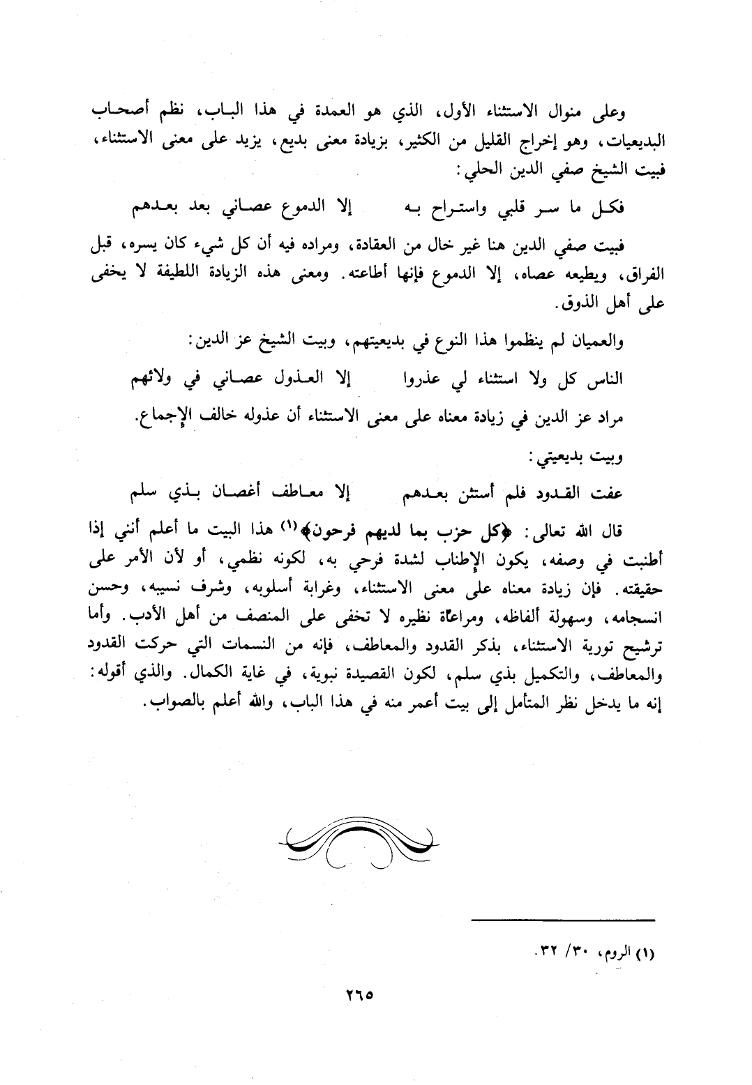 قال الله تعالى: {كُلُّ حِزْبٍ بِمَا لَدَيْهِمْ فَرِحُونَ} 1 هذا البيت ما أعلم أنني إذا أطنبت في وصفه، يكون الإطناب لشدة فرحي به، لكونه نظمي، أو لأن الأمر على حقيقته. فإن زيادة معناه على معنى الاستثناء، وغرابة أسلوبه، وشرف نسيبه، وحسن انسجامه، وسهولة ألفاظه، ومراعاة نظيره لا تخفى على المنصف من أهل الأدب. وأما ترشيح تورية الاستثناء، بذكر القدود والمعاطف، فإنه من النسمات التي حركت القدود والمعاطف، والتكميل بذي سلم، لكون القصيدة نبوية، في غاية الكمال. والذي أقوله: إنه ما يدخل نظر المتأمل إلى بيت أعمر منه في هذا الباب، والله أعلم بالصواب.