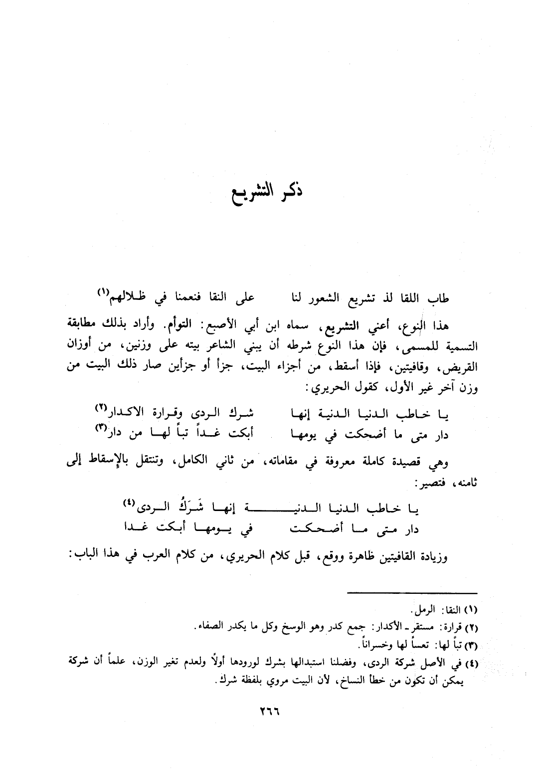 هذا النوع، أعني التشريع، سماه ابن أبي الأصبع، التوأم. وأراد بذلك مطابقة التسمية للمسمى، فإن هذا النوع شرطه أن يبني الشاعر بيته على وزنين، من أوزان القريض، وقافيتين، فإذا أسقط، من أجزاء البيت، جزءًا أو جزأين صار ذلك البيت من وزن آخر غير الأول، كقول الحريري: