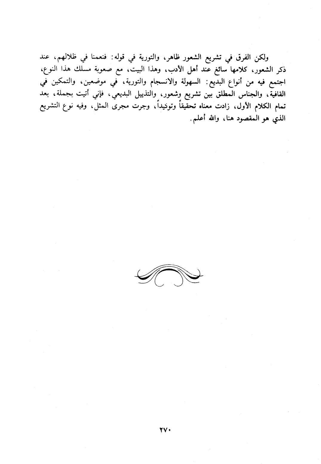 ولكن الفرق في تشريع الشعور ظاهر، والتورية في قوله: فنعمنا في ظلالهم، عند ذكر الشعور، كلاهما سائغ عند أهل الأدب وهذا البيت، مع صعوبة مسلك هذا النوع، اجتمع فيه من أنواع البديع: السهولة والانسجام والتورية، في موضعين، والتمكين في القافية، والجناس المطلق بين تشريع وشعور والتذييل البديعي، فإني أتيت بجملة، بعد تمام الكلام الأول، زادت معناه تحقيقًا وتوكيدًا، وجرى مجرى المثل، وفيه نوع التشريع الذي هو المقصود هنا، والله أعلم.