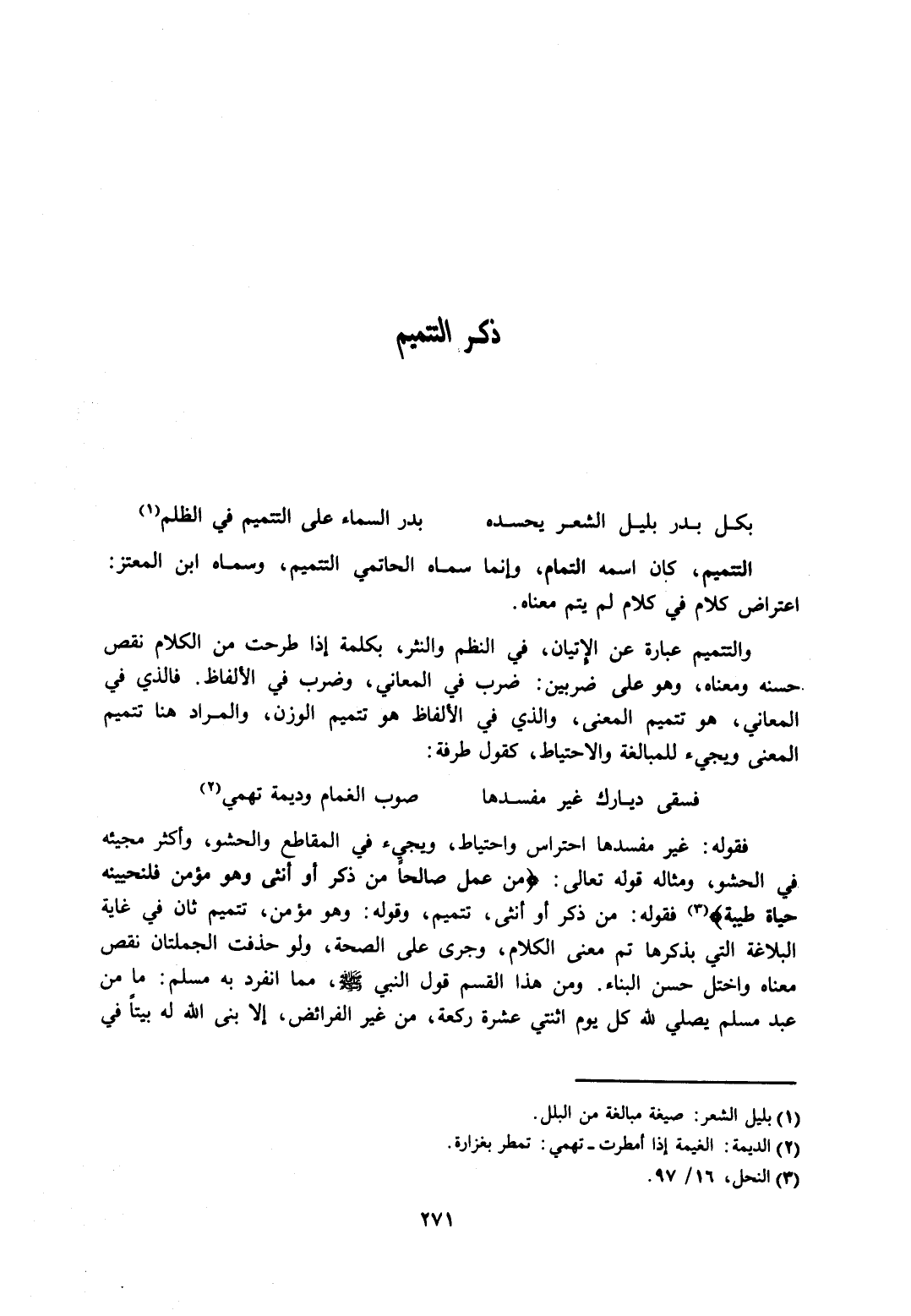 التتميم، كان اسمه التمام، وإنما سماه الحاتمي التتميم، وسماه ابن المعتز: اعتراض كلام في كلام لم يتم معناه.