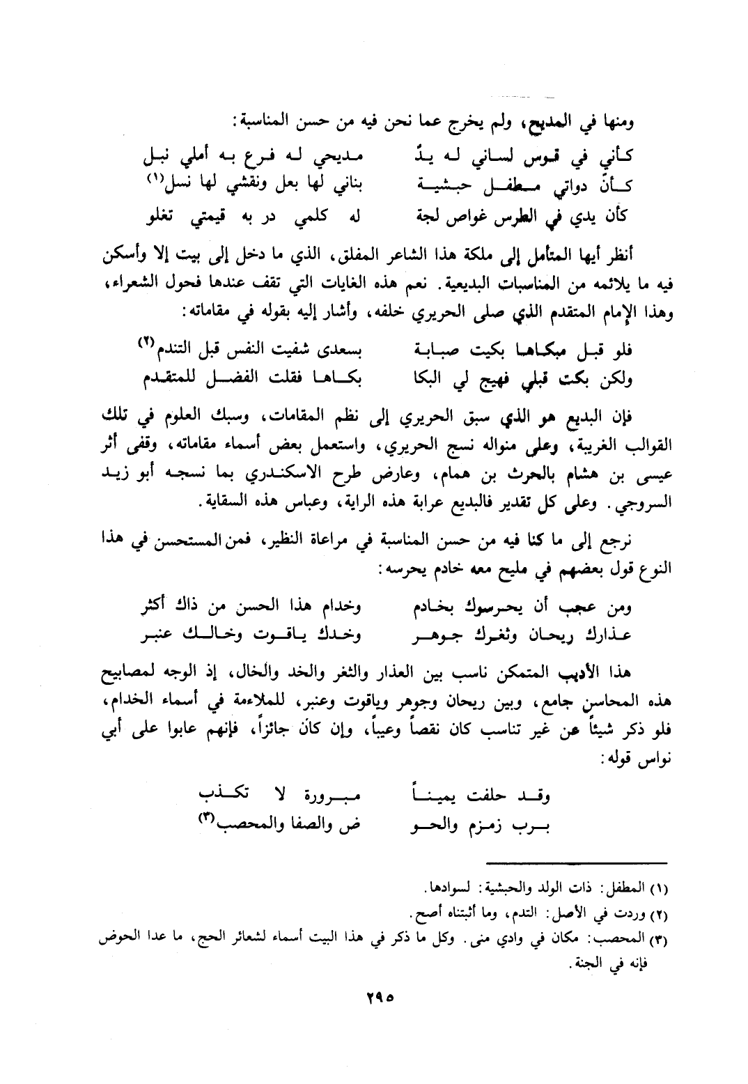 هذا الأديب المتمكن ناسب بين العذار والثغر والخد والخال، إذ الوجه لمصابيح هذه المحاسن جامع، وبين ريحان وجوهر وياقوت وعنبر، للملاءمة في أسماء الخدام فلو ذكر شيئًا من غير تناسب كان نقصًا وعيبًا، وإن كان جائزًا، فإنهم عابوا على أبي نواس قوله: