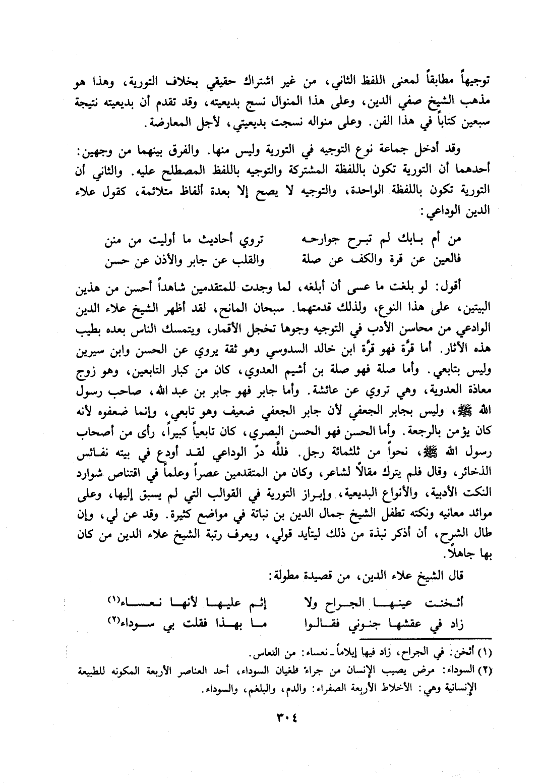 أقول: لو بلغت ما عسى أبلغه، لما وجدت للمتقدمين شاهدًا أحسن من هذين البيتين، على هذا النوع، ولذلك قدمتهما. سبحان المانح، لقد أظهر الشيخ علاء الدين الوادعي من محاسن الأدب في التوجيه وجوهًا تخجل الأقمار، ويتمسك الناس بعده بطيب هذه الآثار. أما قرَّة فهو قرَّة بن خالد السدودسي وهو ثقة يروي عن الحسن وابن سيرين وليس بتابعي. وأما صلة فهو صلة بن أشيم العدوي، كان من كبار التابعين، وهو زوج معاذة العدوية، وهي تروي عن عائشة. وأما جابر فهو جابر بن عبد الله، صاحب رسول الله -صلى الله عليه وسلم-، وليس بجابر الجعفي لأن جابر الجعفي ضعيف وهو تابعي، وإنما ضعفوه لأنه كان يؤمن بالرجعة. وأما الحسن فهو الحسن البصري، كان تابعيًّا كبيرًا، رأى أصحاب رسول الله -صلى الله عليه وسلم-، نحوًا من ثلثمائة رجل. فللَّه در الوداعي لقد أودع في بيته نفائس الذخائر، وقال فلم يترك مقالًا لشاعر، وكان من المتقدمين عصرًا وعلمًا في اقتناص شوارد النكت الأدبية، والأنواع البديعية، وإبراز التورية في القوالب التي لم يسبق إليها، وعلى موائد معانيه ونكته تطفل الشيخ جمال الدين بن نباتة في مواضع كثيرة. وقد عن لي، وإن طال الشرح، أن أذكر نبذة من ذلك ليتأيد قولي، ويعرف رتبة الشيخ علاء الدين من كان بها جاهلًا.