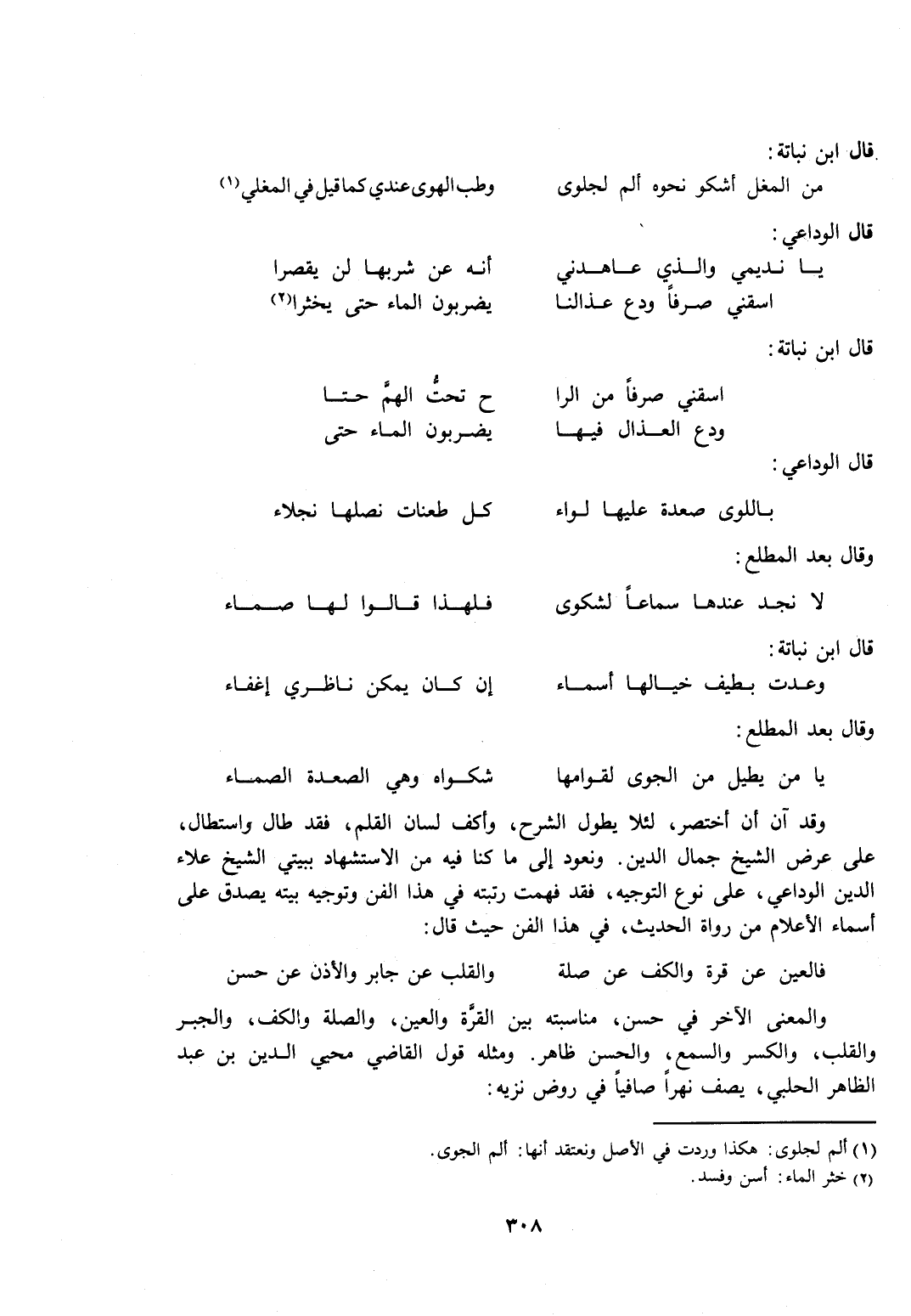 وقد آن أن أختصر، لئلا يطول الشرح، وأكف لسان القلم، فقد طال واستطال، على عرض الشيخ جمال الدين. ونعود إلى ما كنا فيه من الاستشهاد ببيتي الشيخ علاء الدين الوداعي، على نوع التوجيه، فقد فهمت رتبته في هذا الفن وتوجيه بيته يصدق على أسماء الأعلام من رواة الحديث، في هذا الفن حيث قال:
