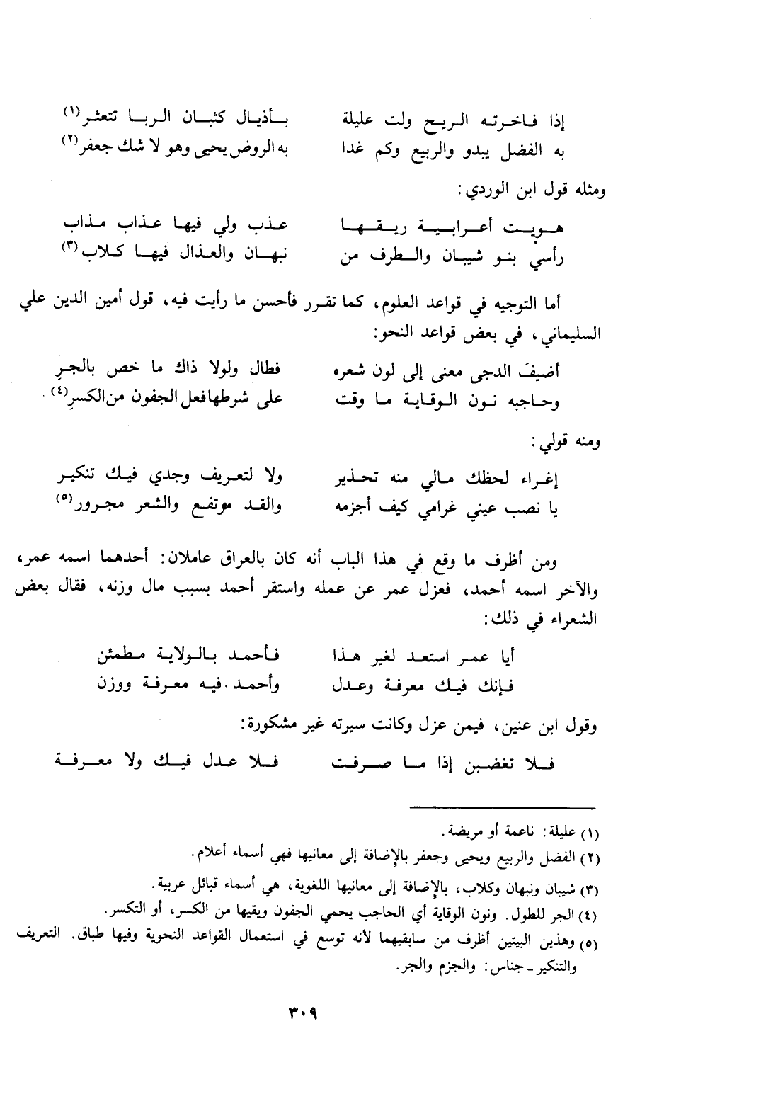 5 وهذين البيتين أظرف من سابقيهما لأنه توسع في استعمال القواعد النحوية وفيها طباق. التعريف والتنكير، جناس: والجزم والجر.