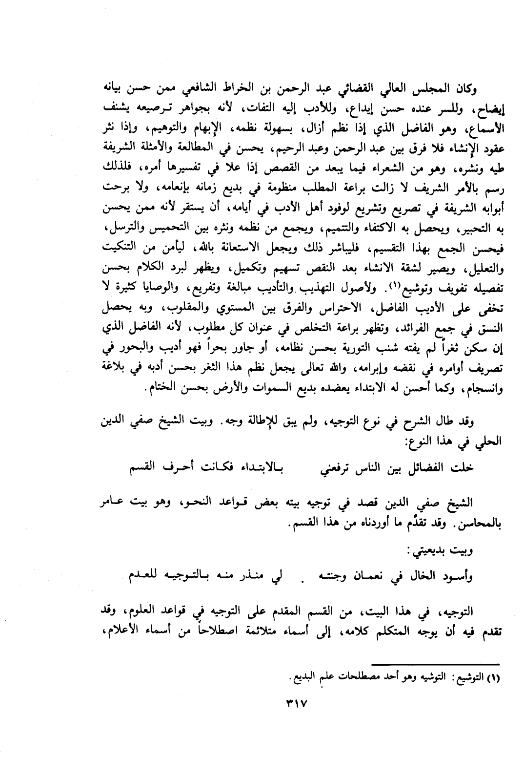 وكان المجلس العالي القضائي عبد الرحمن بن الخراط الشافعي ممن حسن بيانه إيضاح، وللسر عنده حسن إيداع، وللأدب إليه التفات، لأنه بجواهر ترصيعه يشنف الأسماع، وهو الفاضل الذي إذا نظم أزال، بسهولة نظمه، الإبهام والتوهيم، وإذا نثر عقود الإنشاء فلا فرق بين عبد الرحمن وعبد الرحيم، يحسن في المطالعة والأمثلة الشريفة طيه ونشره، وهو من الشعراء فيما يبعد من القصص إذا علا في تفسيرها أمره، فلذلك رسم بالأمر الشريف لا زالت براعة المطلب منظومة في بديع زمانه بإنعامه، ولا برحت أبوابه الشريفة في تصريع وتشريع لوفود أهل الأدب في أيامه، أن يستقر لأنه ممن يحسن في التحبير، ويحصل به الاكتفاء والتتميم، ويجمع من نظمه ونثره بين التحميس والترسل، فيحسن الجمع بهذا التقسيم، فليباشر ذلك ويجعل الاستعانة بالله، ليأمن من التنكيت والتعليل، ويصير لشقة الإنشاء بعد النقص تسهيم وتكميل، ويظهر لبرد الكلام بحسن تفصيله تفويف وتوشيع1. ولأصول التهذيب والتأديب مبالغة وتفريع، والوصايا كثيرة لا تخفى على الأديب الفاضل، الاحتراس والفرق بين المستوي والمقلوب، وبه يحصل النسق في جميع الفرائد، وتظهر براعة التخلص في عنوان كل مطلوب، لأنه الفاضل الذي إن سكن ثغرًا لم يفته شنب التورية بحسن نظامه، أو جاور بحرًا فهو أديب والبحور في تصريف أوامره في نقضه وإبرامه، والله تعالى يجعل نظم هذا الثغر بحسن أدبه في بلاغة وانسجام، وكما أحسن له الابتداء يعضده بديع السموات والأرض بحسن الختام.