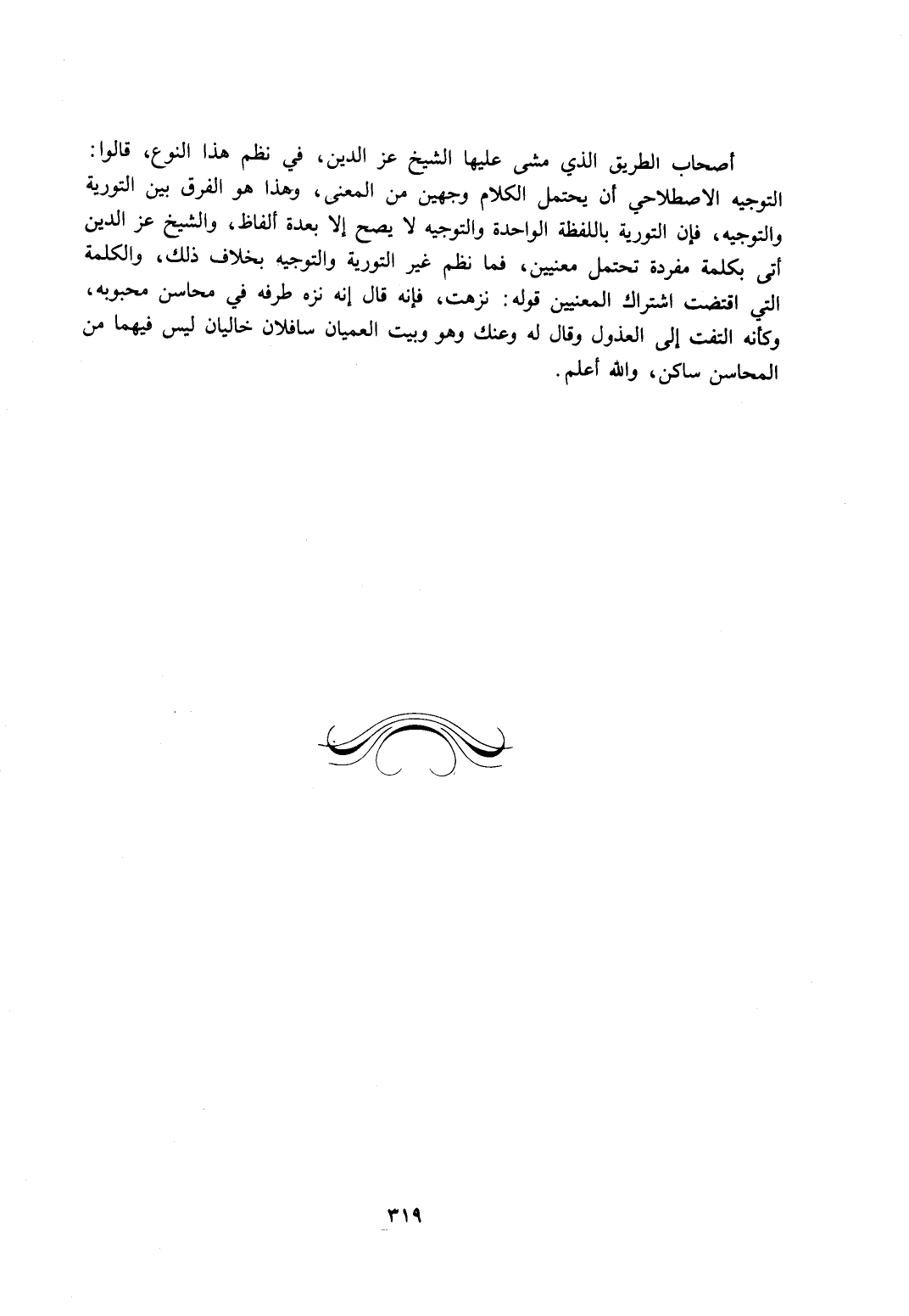 أصحاب الطريق الذي مشى عليها الشيخ عز الدين، في نظم هذا النوع، قالوا: التوجيه الاصطلاحي أن يحتمل الكلام وجهين من المعنى، وهذا هو الفرق بين التورية والتوجيه، فإن التورية باللفظة الواحدة والتوجيه لا يصح إلا بعدة ألفاظ، والشيخ عز الدين أتى بكلمة مفردة تحتمل معنيين، فما نظم غير التورية والتوجيه بخلاف ذلك، والكلمة التي اقتضت اشتراك المعنين قوله: نزهت، فإنه قال إنه نزه طرفه في محاسن محبوبه، وكأنه التفت إلى العذول وقال له وعنك وهو بيت العميان سافلان خاليان ليس فيهما من المحاسن ساكن، والله أعلم.