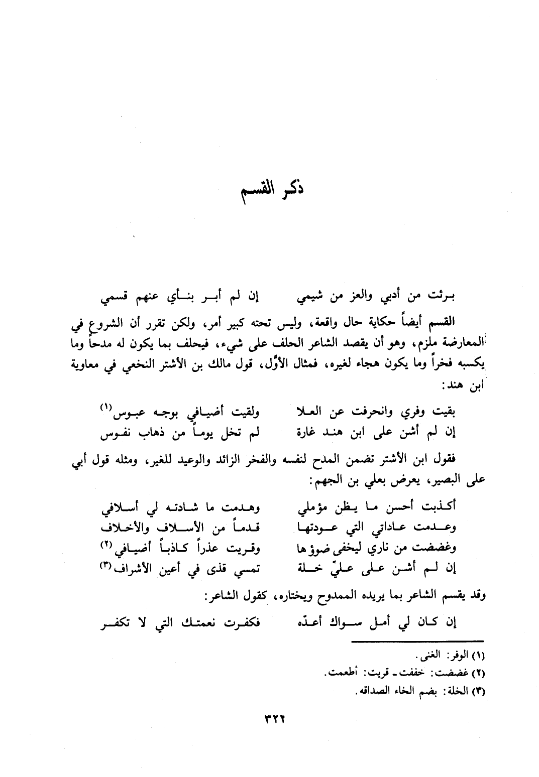 القسم أيضًا حكاية حال واقعة، وليس تحته كبير أمر، ولكن تقرر أن الشروع في المعارضة ملزم، وهو أن يقصد الشاعر الحلف على شيء، فيحلف بما يكون له مدحًا وما يكسبه فخرًا وما يكون هجاء لغيره، فمثال الأول، قول مالك بن الأشتر النخعي في معاوية بن هند: