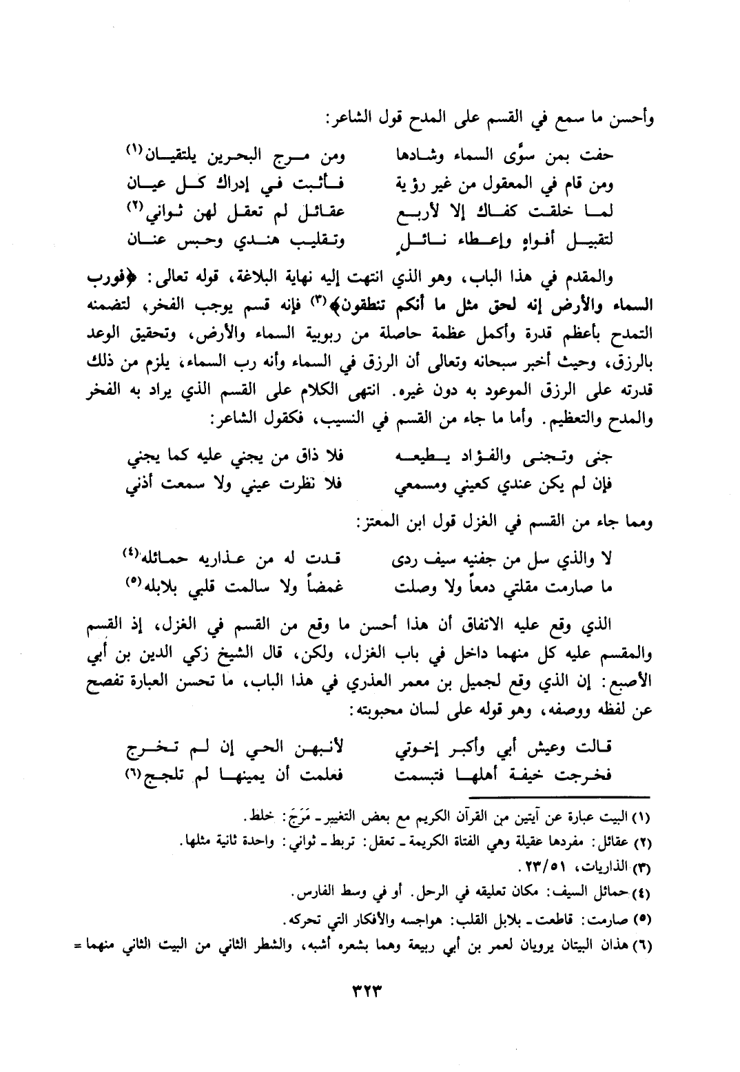 والمقدم في هذا الباب، وهو الذي انتهت إليه نهاية البلاغة، قوله تعالى: {فَوَرَبِّ السَّمَاءِ وَالْأَرْضِ إِنَّهُ لَحَقٌّ مِثْلَ مَا أَنَّكُمْ تَنْطِقُونَ} 3 فإنه قسم يوجب الفخر، لتضمنه التمدح بأعظم قدرة وأكمل عظمة حاصلة من ربوبية السماء والأرض، وتحقيق الوعد بالرزق، وحيث أخبر سبحانه وتعالى أن الرزق في السماء وأنه رب السماء، يلزم من ذلك قدرته على الرزق الموعود به دون غيره. انتهى الكلام على القسم الذي يراد به الفخر والمدح والتعظيم. وأما ما جاء من القسم في النسيب فكقول الشاعر:
