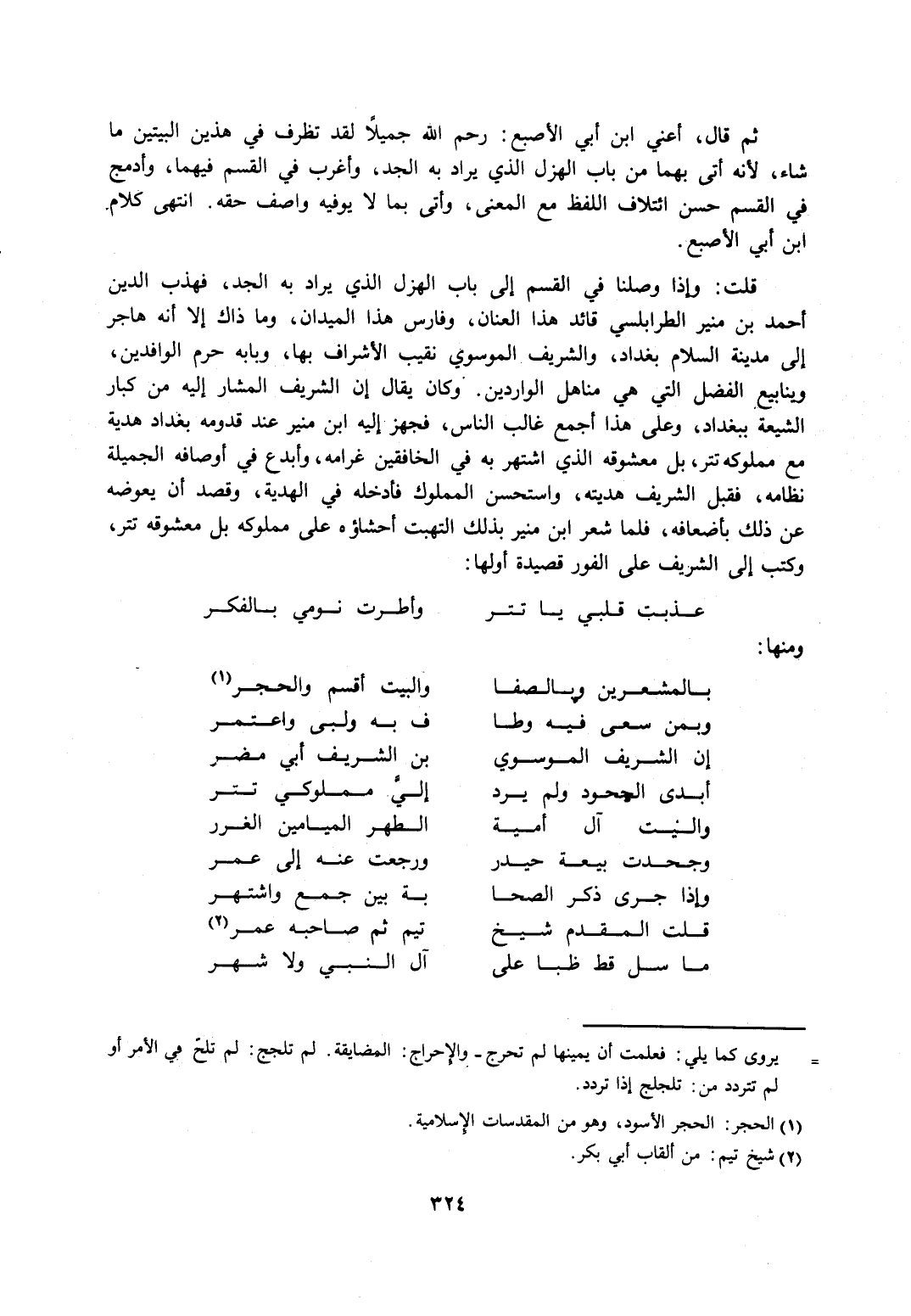 قلت: وإذا وصلنا في القسم إلى باب الهزل الذي يراد به الجد، فهذب الدين بن منير الطرابلسي قائد هذا العنان، وفارس هذا الميدان، وما ذاك إلا أنه هاجر إلى مدينة السلام بغداد، والشريف الموسوي نقيب الأشراف بها، وبابه حرم الوافدين، وينابيع الفضل التي هي مناهل الواردين. وكان يقال إن الشريف المشار إليه من كبار الشيعة ببغداد، وعلى هذا أجمع غالب الناس، فجهز إليه ابن منير عند قدومه بغداد هدية مع مملوكه تتر، بل معشوقه الذي اشتهر به في الخافقين غرامه، وأبدع في أوصافه الجميلة نظامه، فقبل الشريف هديته، واستحسن المملوك فأدخله في الهدية، وقصد أن يعوضه على ذلك بأضعافه، فلما شعر ابن منير بذلك التهبت أحشاؤه على مملوكه بل معشوقه تتر، وكتب إلى الشريف على الفور قصيدة أولها: