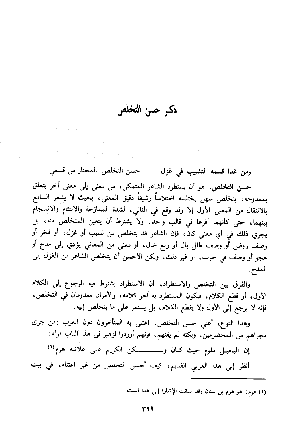 وهذا النوع، أعني حسن التخلص، اعتنى به المتأخرون دون العرب ومن جرى مجراهم من المخضرمين، ولكنه لم يفتهم، فإنهم أوردوا لزهير في هذا الباب قوله: