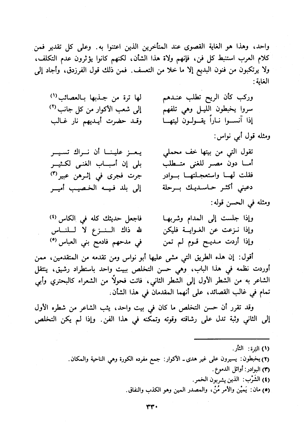 أقول: إن هذه الطريق التي مشى عليها أبو نواس ومن تقدمه من المتقدمين، ممن أوردت نظمه في هذا الباب، وهي حسن التخلص بيت واحد باستطراد رشيق، ينتقل الشاعر به من الشطر الأول إلى الشطر الثاني، فاتت فحولًا من الشعراء كالبحتري وأبي تمام في غالب القصائد، على أنهما المقدمان في هذا الشأن.