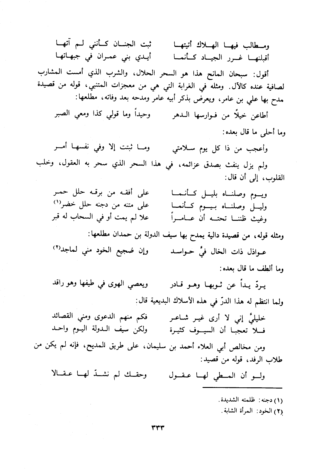 أقول: سبحان المانح هذا هو السحر الحلال، والشرب الذي أمست المشارب لصافية عنده كالآل. ومثله في الغرابة التي هي من معجزات المتنبي، قوله من قصيدة مدح بها علي بن عامر، ويعرض بذكر أبيه عامر ومدحه بعد وفاته، مطلعها: