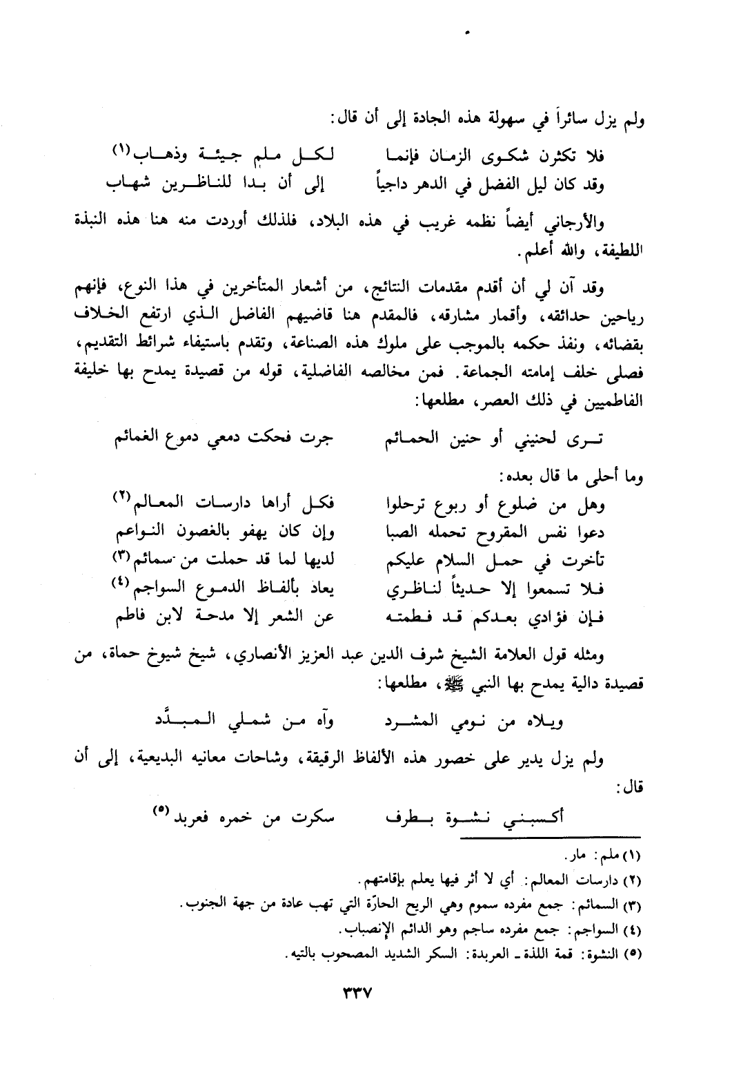 ومثله قول العلامة الشيخ شرف الدين عبد العزيز الأنصاري، شيخ شيوخ حماة، من قصيدة دالية يمدح بها النبي صلى الله عليه وسلم، مطلعها: