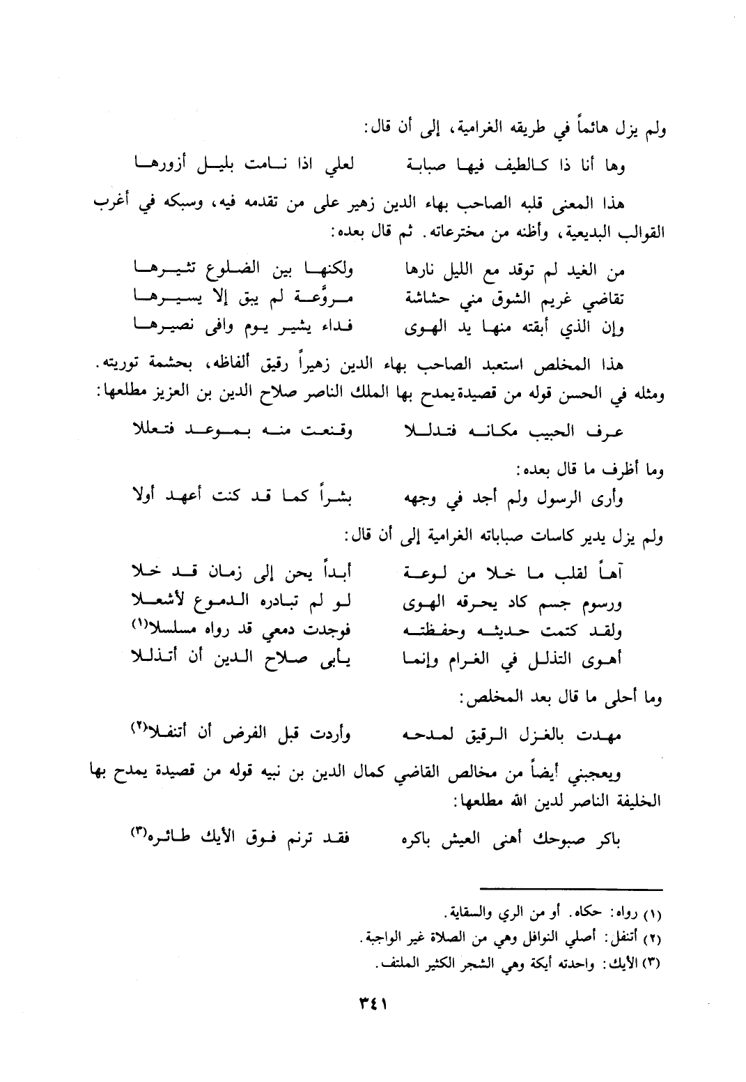 هذا المخلص استبعد الصاحب بهاء الدين زهيرًا رقيق ألفاظه، بحشمة توريتة. ومثله في الحسن قوله من قصيدة يمدح بها الملك الناصر صلاح الدين بن العزيز مطلعها: