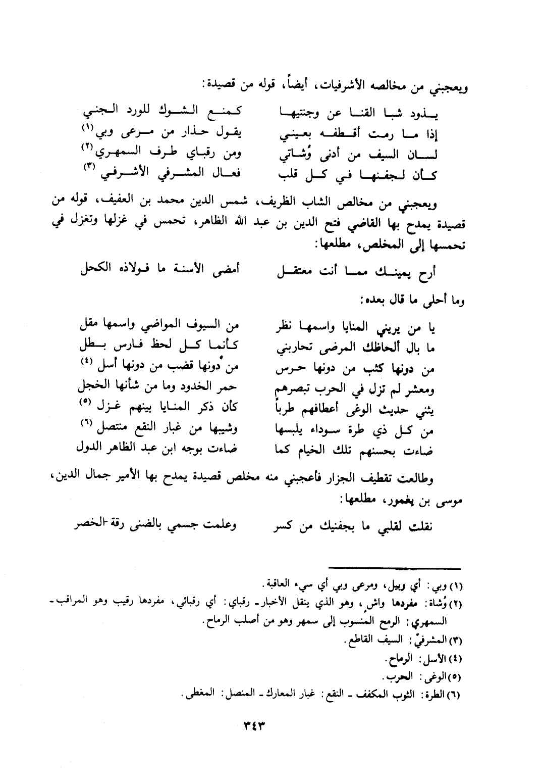 ويعجبني من مخالص الشاب الظريف، شمس الدين محمد بن العفيف، قوله من قصيدة يمدح بها القاضي فتح الدين عبد الله الظاهر، تحمس في غزلها وتغزل في تحمسها إلى المخلص، مطلعها: