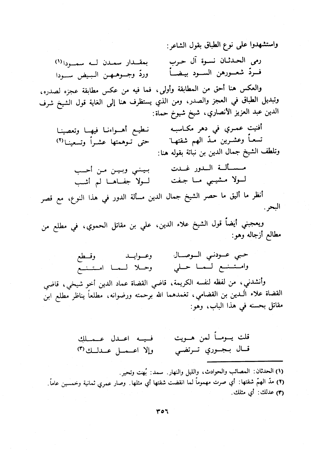 والعكس هنا أحق من المطابقة وأولى، فما فيه من عكس مطابقة عجزه لصدره، وتبديل الطباق في العجز والصدر، ومن الذي يستظرف هنا إلى الغاية قول الشيخ شرف الدين عبد العزيز الأنصاري، شيخ شيوخ حماة:
