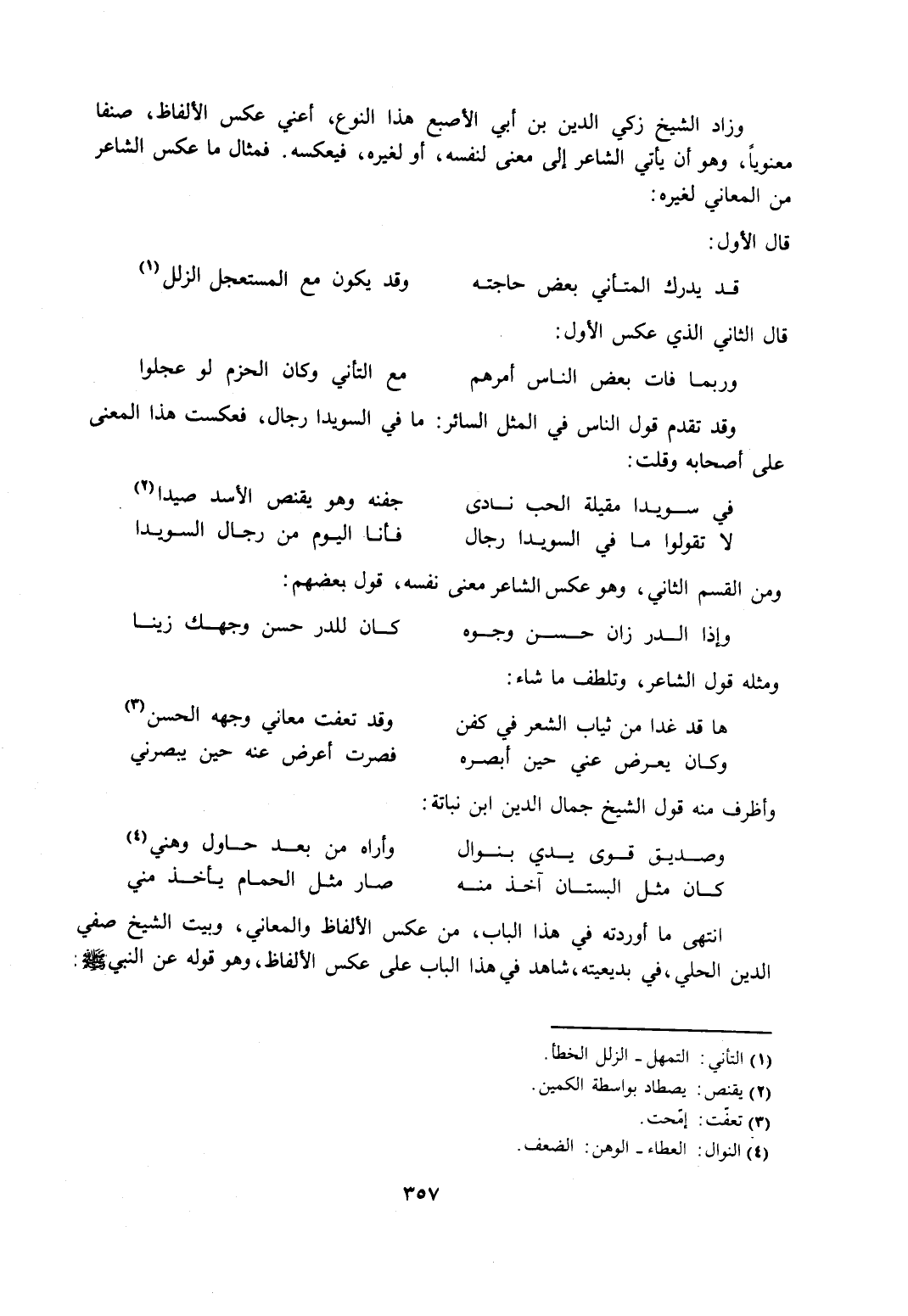 وزاد الشيخ زكي الدين بن أبي الأصبع هذا النوع، أعني عكس الألفاظ، صنفا معنويًّا، وهو أن يأتي الشاعر إلى معنى لنفسه، أو لغيره، فيعكسه، فمثال ما عكس الشاعر من المعاني لغيره.