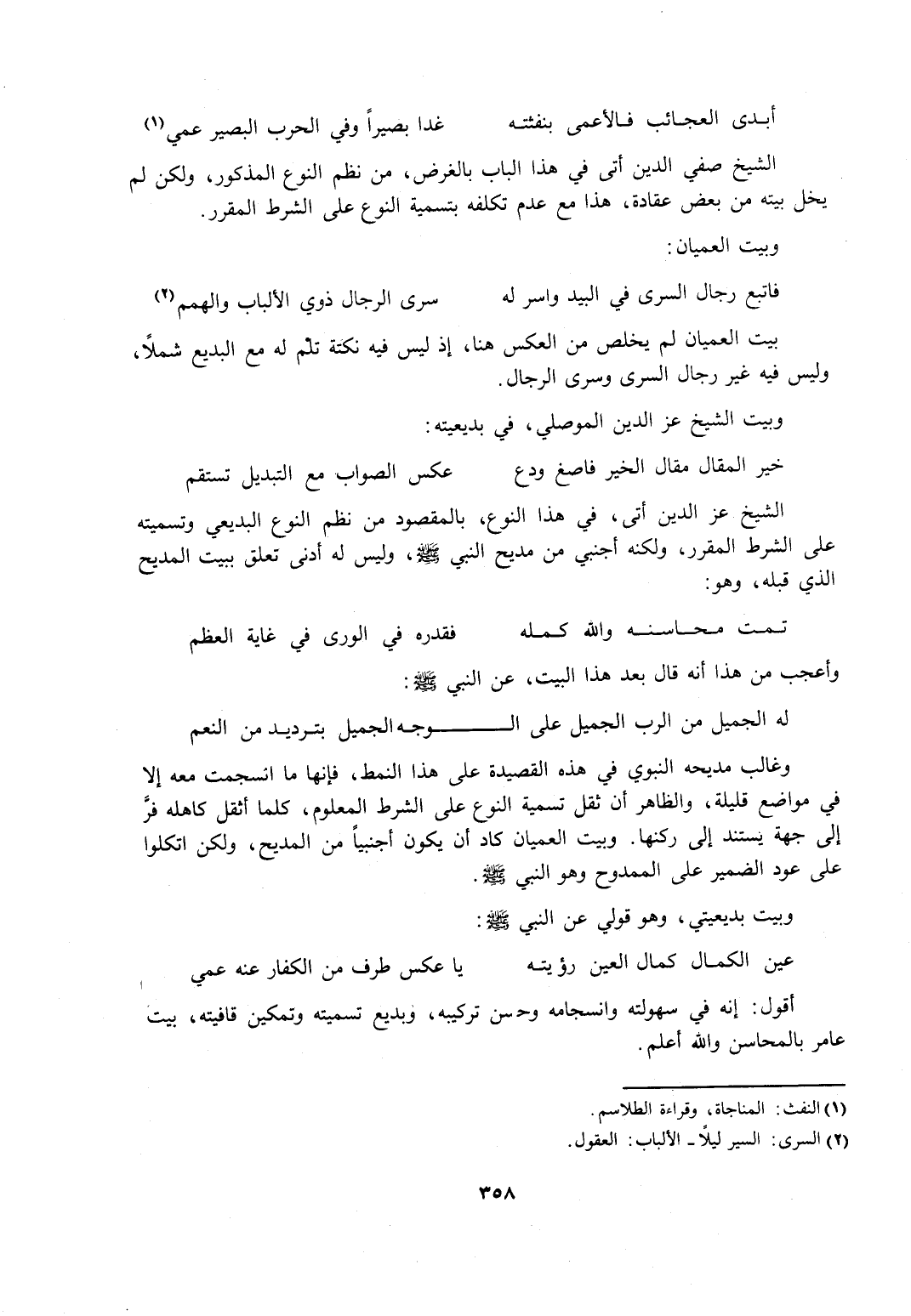 الشيخ صفي الدين أتى في هذا الباب بالغرض، من نظم النوع المذكور، ولكن لم يخل بيته من بعض عقادة، هذا مع عدم تكلفه بتسمية النوع على الشرط المقرر.