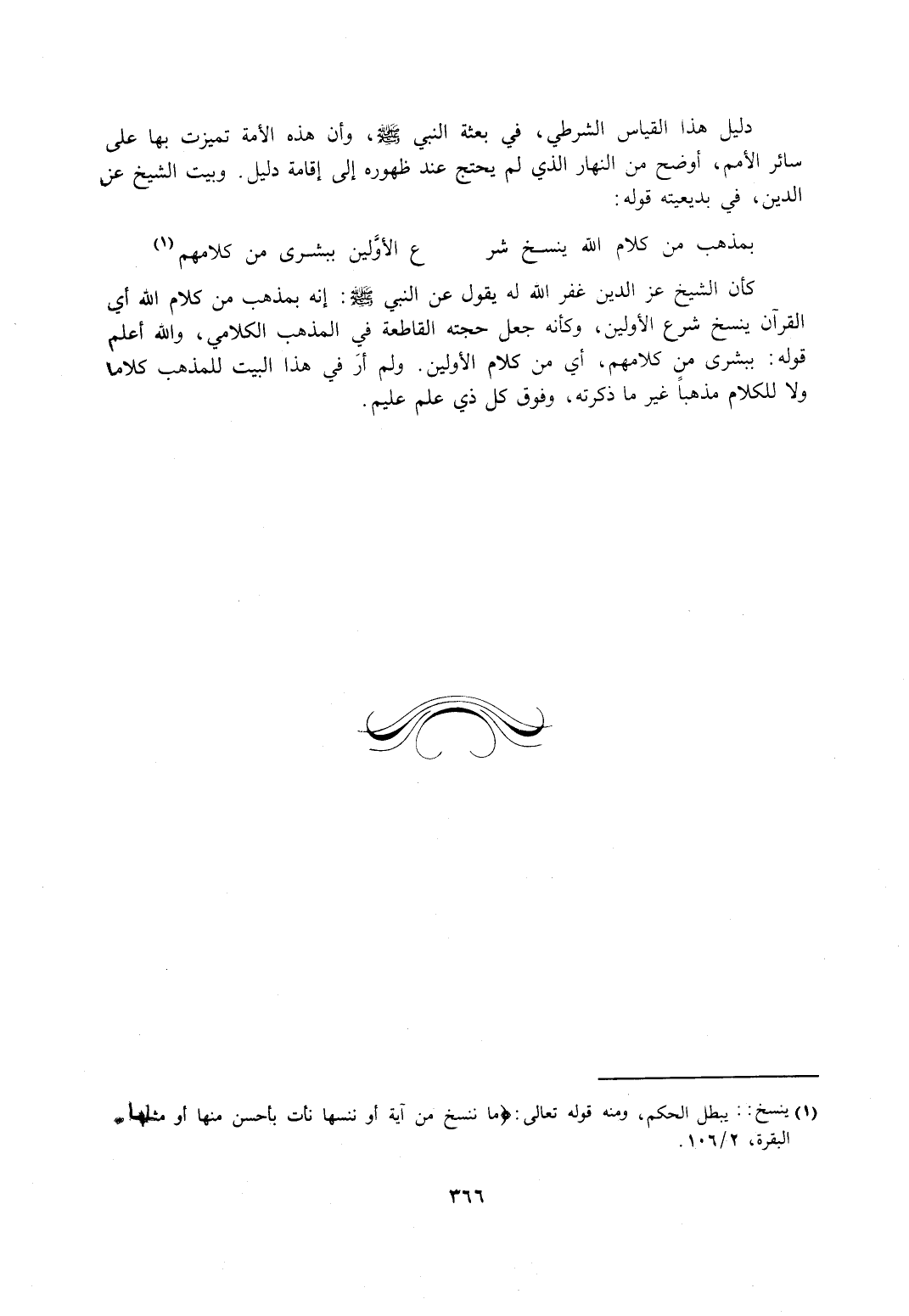 كأن الشيخ عز الدين غفر الله له يقول عن النبي -صلى الله عليه وسلم- إنه بمذهب من كلام الله أي القرآن ينسخ شرع الأولين، وكأنه جعل حجته القاطعة في المذهب الكلامي، والله أعلم. قوله: ببشرى من كلامهم، أي من كلام الأولين. ولم أرَ في هذا البيت للمذهب كلامًا ولا للكلام مذهبًا غير ما ذكرته، وفوق كل ذي علم عليم.