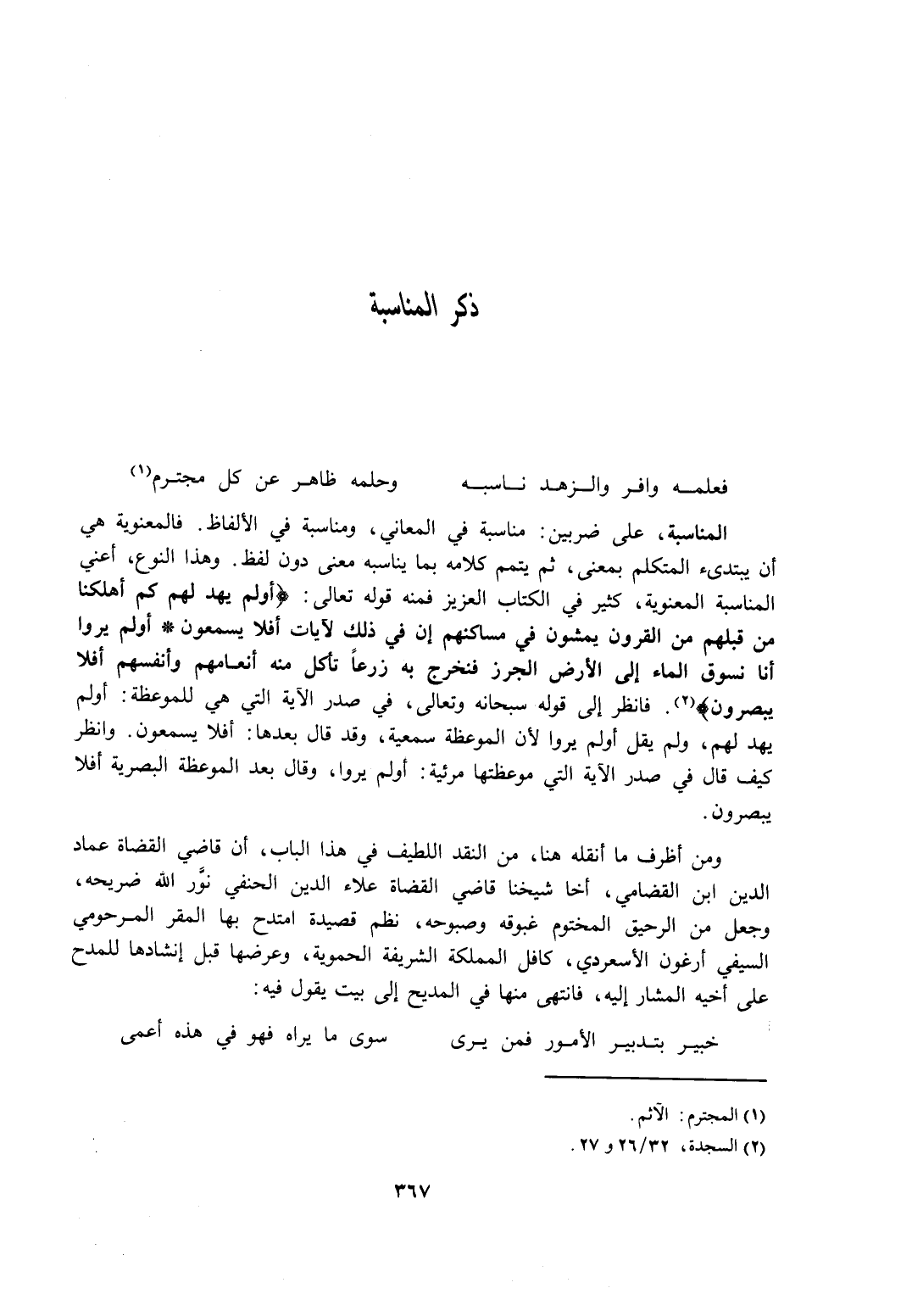 المناسبة، على ضربين: مناسبة في المعاني، ومناسبة في الألفاظ. فالمعنوية هي أن يبتدئ المتكلم بمعنى، ثم يتمم كلامه بما يناسب معنى دون لفظ. وهذا النوع، أعني المناسبة المعنوية، كثير في الكتاب العزيز فمنه قوله تعالى: {أَوَلَمْ يَهْدِ لَهُمْ كَمْ أَهْلَكْنَا مِنْ قَبْلِهِمْ مِنَ الْقُرُونِ يَمْشُونَ فِي مَسَاكِنِهِمْ إِنَّ فِي ذَلِكَ لَآياتٍ أَفَلا يَسْمَعُونَ، أَوَلَمْ يَرَوْا أَنَّا نَسُوقُ الْمَاءَ إِلَى الْأَرْضِ الْجُرُزِ فَنُخْرِجُ بِهِ زَرْعًا تَأْكُلُ مِنْهُ أَنْعَامُهُمْ وَأَنْفُسُهُمْ أَفَلا يُبْصِرُونَ} 2. فانظر إلى قوله سبحانه وتعالى، في صدر الآية التي هي للموعظة: أولم يهد لهم، ولم يقل أولم يروا لأن الموعظة سمعية، وقد قال بعدها: أفلا يسمعون. وانظر كيف قال في صدر الآية التي موعظتها مرئية: أولم يروا، وقال بعد الموعظة البصرية أفلا يبصرون.