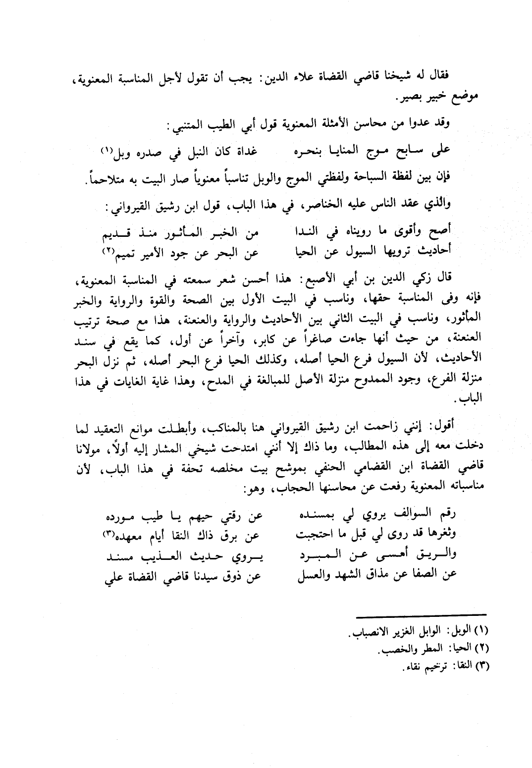 قال زكي الدين بن أبي الأصبع: هذا أحسن شعر سمعته في المناسبة المعنوية، فإنه وفى المناسبة حقها، وناسب في البيت الأول بين الصحة والقوة والرواية والخبر المأثور، وناسب في البيت الثاني بين الأحاديث والرواية والعنعنة، هذا مع صحة ترتيب العنعنة، من حيث أنها جاءت صاغرًا عن كابر وآخرًا عن أول، كما يقع في سند الأحاديث، لأن السيول فرع الحيا أصله، وكذلك الحيا فرع البحر أصله، ثم نزل البحر منزلة الفرع، وجود الممدوح منزلة الأصل للمبالغة في المدح، وهذا غاية الغايات في هذا الباب.