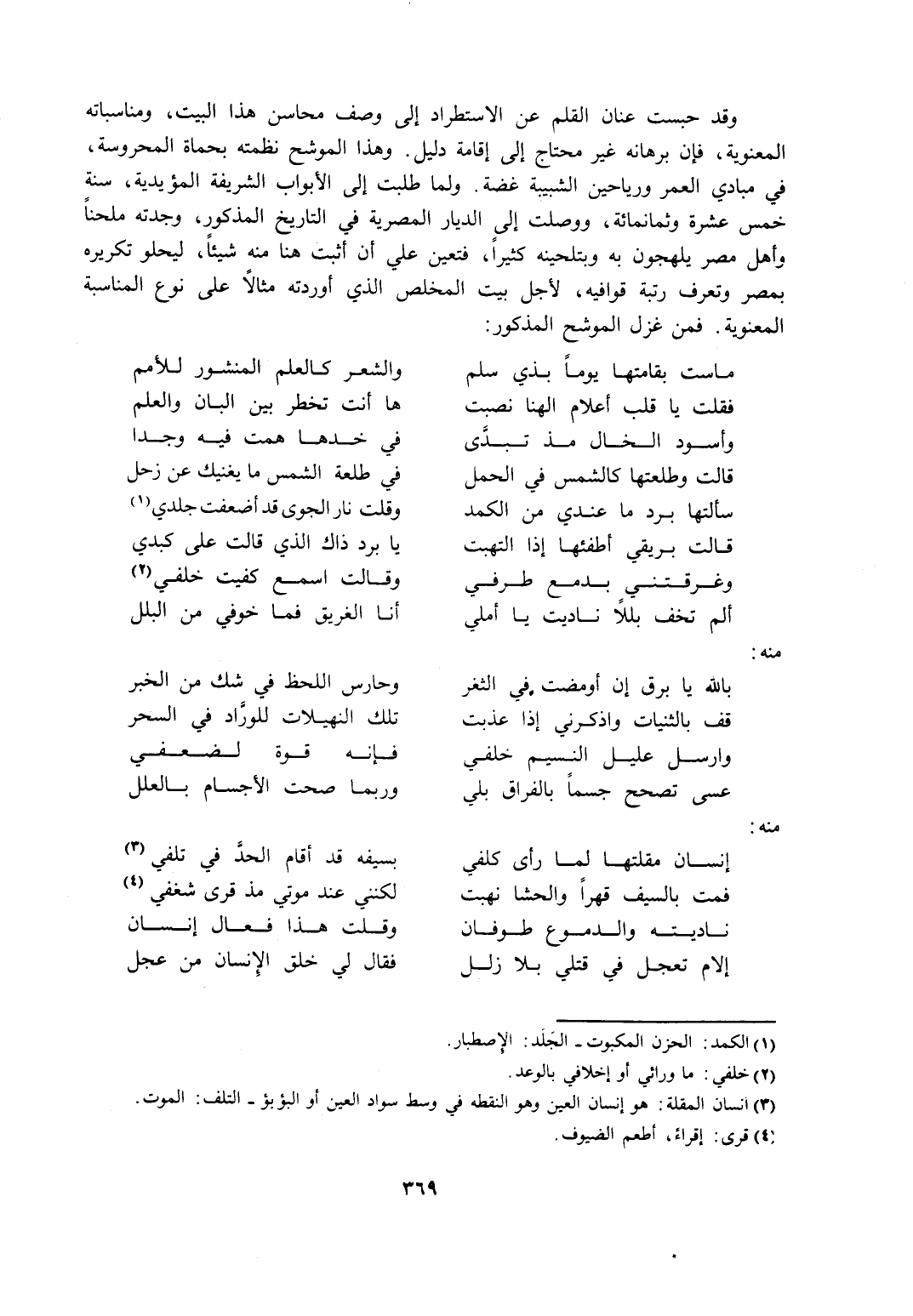 وقد حبست عنان القلم عن الاستطراد إلى وصف هذا البيت، ومناسباته المعنوية، فإن برهانه غير محتاج إلى إقامة دليل. وهذا الموشح نظمته بحماة المحروسة، في مبادي العمر ورياحين الشبيبة غضة. ولما طلبت إلى الأبواب الشريفة المؤيدية، سنة خمس عشرة وثمانمائة، ووصلت إلى الديار المصرية في التاريخ المذكور، وجدته ملحنًا وأهل مصر يلهجون به وبتلحينه كثيرًا، فتعين علي أن أثبت هنا منه شيئًا، ليحلو تكريره بمصر وتعرف رتبة قوافيه، لأجل بيت المخلص الذي أوردته مثالًا على نوع المناسبة المعنوية، فمن غزل الموشح المذكور: