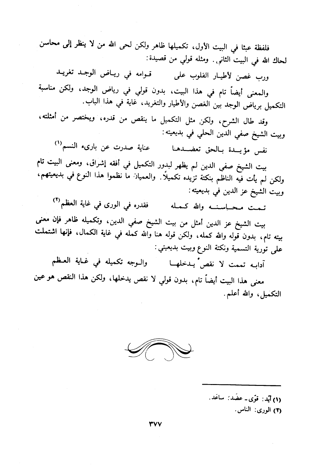 وقد طال الشرح، ولكن مثل التكميل ما يقنص من قدره، ويختصر من أمثلته، وبيت الشيخ صفي الدين الحلي في بديعيته: