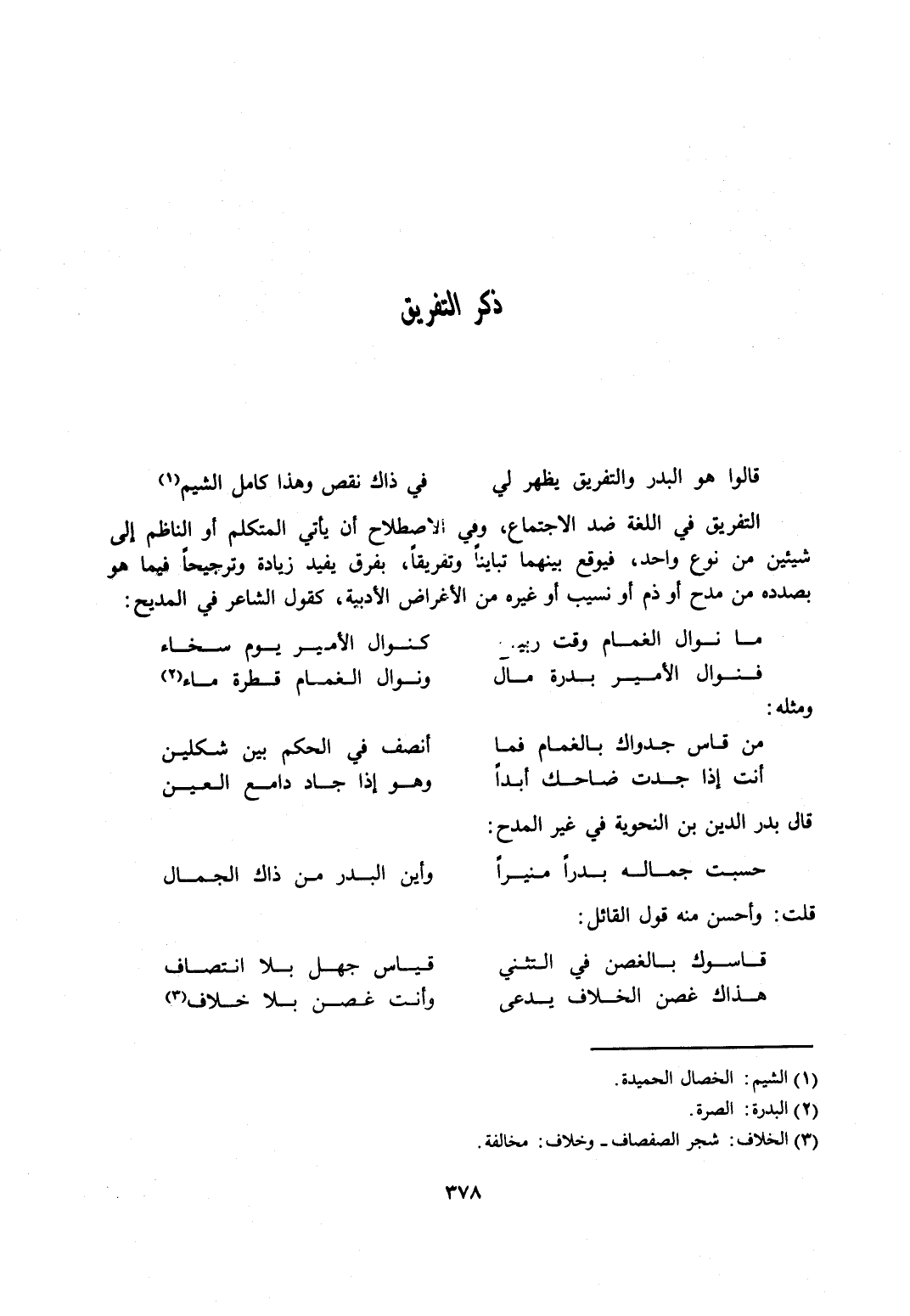 التفريق في اللغة ضد الاجتماع، وفي الاصطلاح أن يأتي المتكلم أو الناظم إلى شيئين من نوع واحد، فيوقع بينهما تباينًا وتفريقًا، بفرق يفيد زيادة وترجيحًا فيما هو بصدده من مدح أو ذم أو نسيب أو غيره من الأغراض الأدبية، كقول الشاعر في المديح: