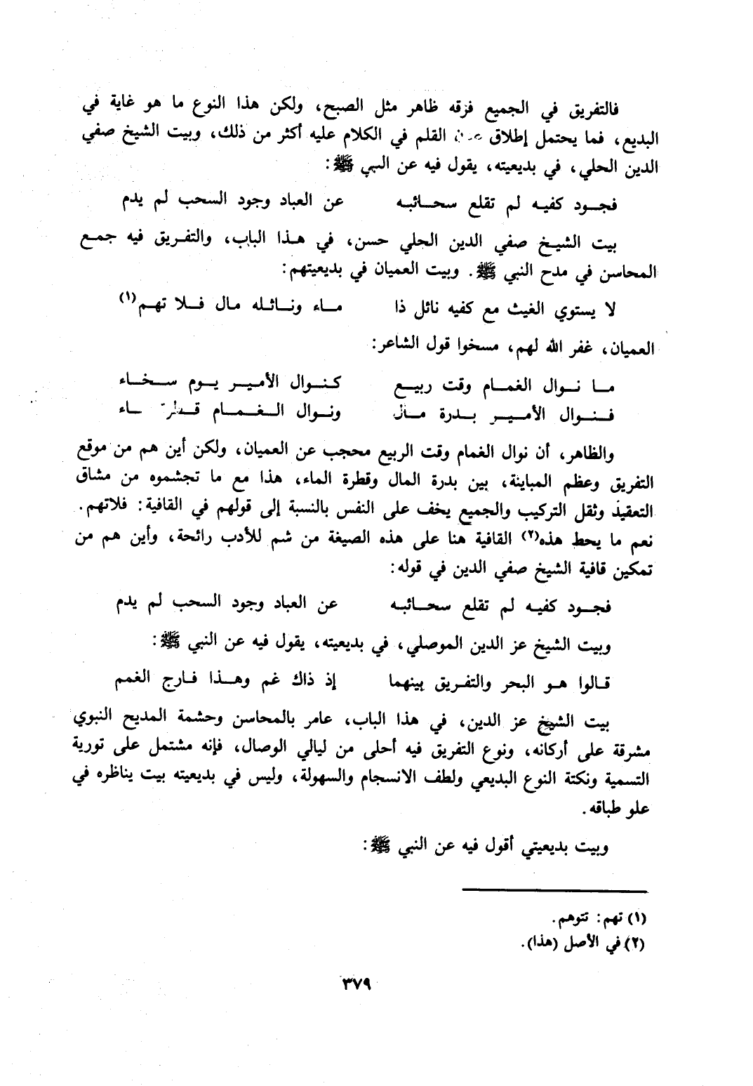 فالتفريق في الجميع فرقه ظاهر مثل الصبح، ولكن هذا النوع ما هو غاية في البديع، فما يحتمل إطلاق عنان القلم في الكلام عليه أكثر من ذلك، وبيت الشيخ صفي الدين الحلي، في بديعيته، يقول فيه عن النبي صلى الله عليه وسلم: