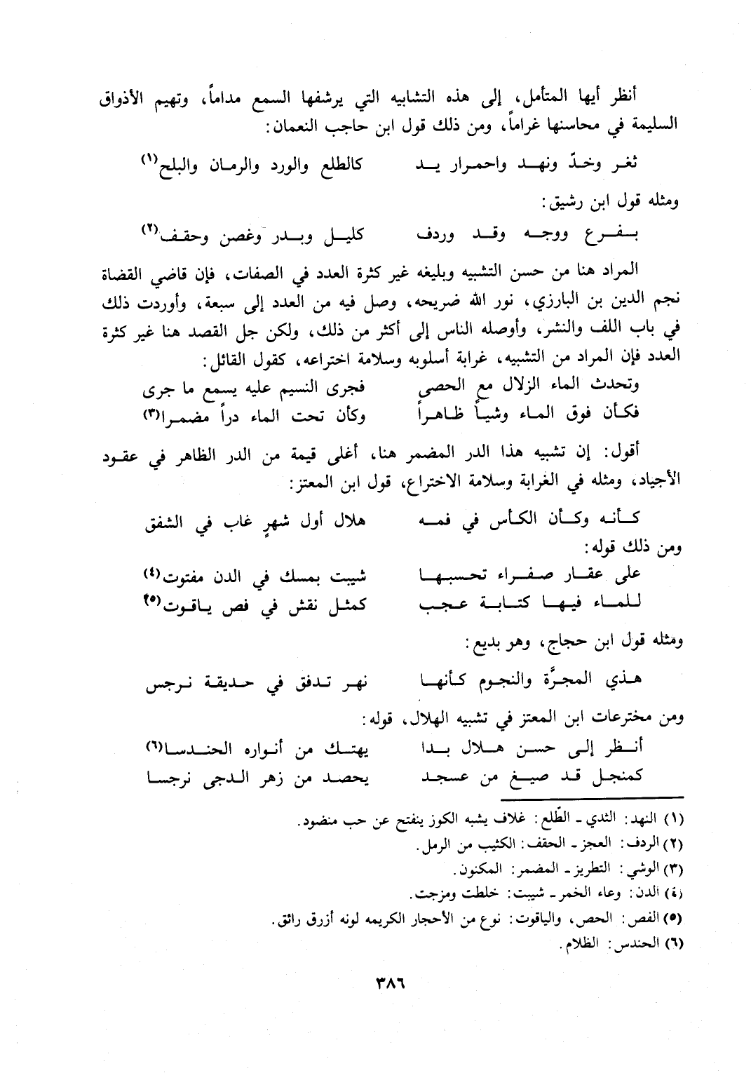 انظر أيها المتأمل، إلى هذه التشابيه التي يرشفها السمع مدامًا، وتهيم الأذواق السليمة في محاسنها غرامًا، ومن ذلك قول ابن حاجب النعمان: