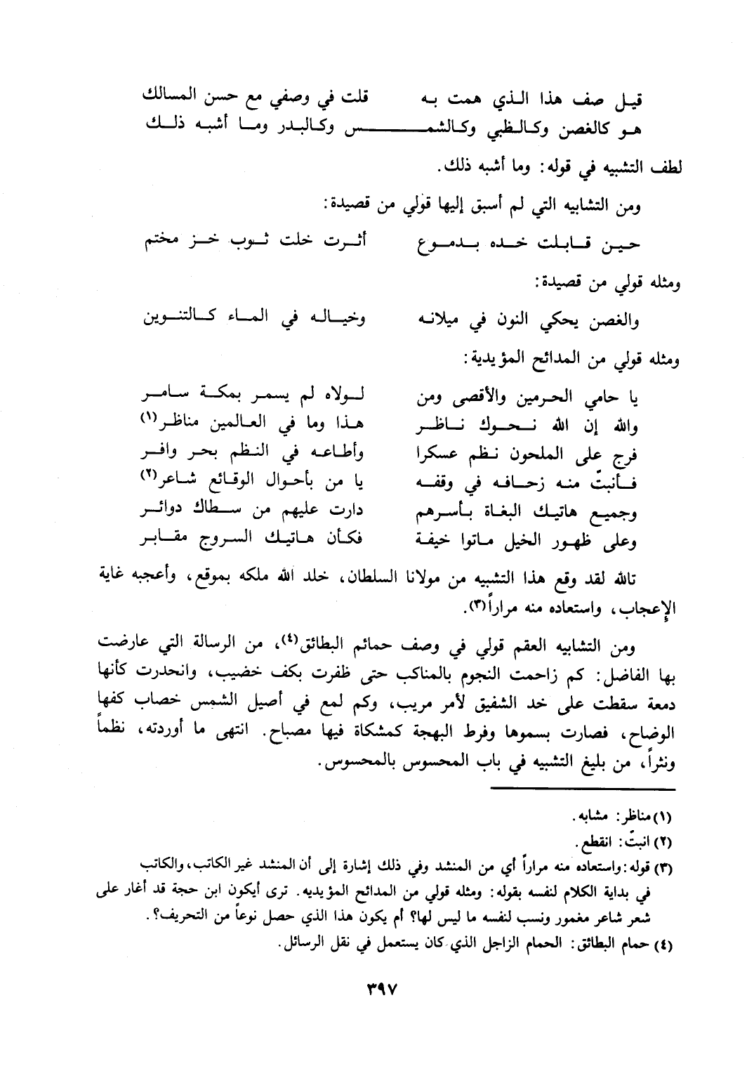 3 قوله: واستعاده منه مرارًا أي في المنشد وفي ذلك إشارة إلى أن المنشد غير الكاتب، والكاتب في بداية الكلام لنفسه بقوله: ومثله قولي في المدائح المؤيدية، ترى أيكون ابن حجة قد أغار على شعر شاعر مغمور ونسب لنفسه ما ليس لها؟ أم يكون هذا الذي حصل نوعًا من التحريف؟