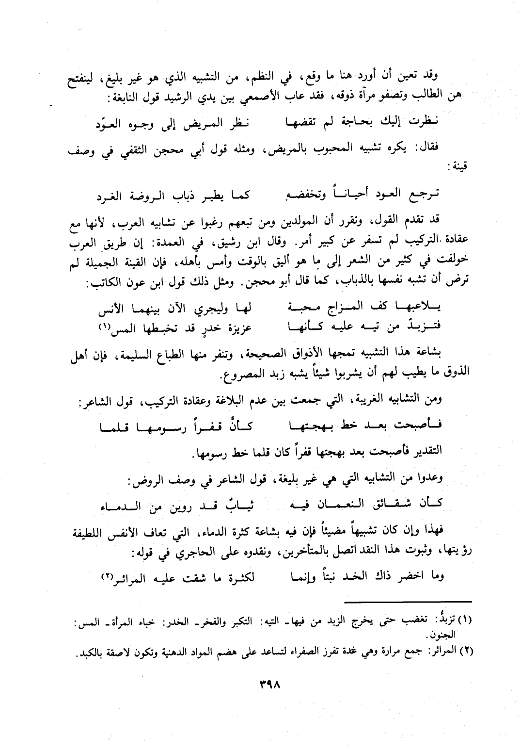 قد تقدم القول، وتقرر أن المولدين ومن تبعهم رغبوا عن تشابيه العرب، لأنها مع عقادة التركيب لم تسفر عن كبير أمر. وقال ابن رشيق، في العمدة: إن طريق العرب خولفت في كثير من الشعر إلى ما هو أليق بالوقت وأمس بأهله، فإن القينة الجميلة لم ترض أن تشبه نفسها بالذباب، كما قال أبو محجن. ومثل ذلك قول ابن عون الكاتب: