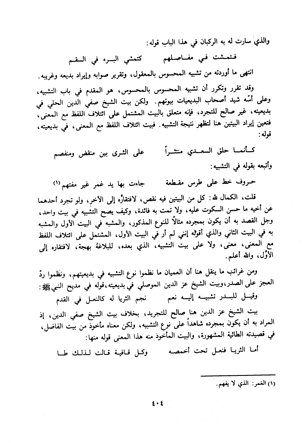 وقد تقرر وتكرر أن تشبيه، وعلى أسّه شيد أصحاب البديعيات بيوتهم. ولكن بيت الشيخ صفي الدين الحلي في بديعيته، غير صالح للتجرد، فإنه متعلق بالبيت المشتمل على ائتلاف اللفظ مع المعنى، فتعين إيراد البيتين هنا لتظهر نتيجة التشبيه. فبيت ائتلاف اللفظ مع المعنى، في بديعيته، قوله: