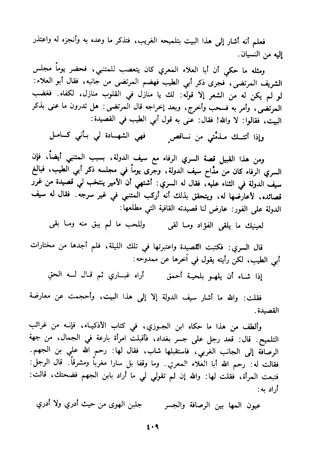 ومثله ما حكي أن أبا العلاء المعري كان يتعصب للمتنبي، فحضر يومًا مجلس الشريف المرتضى، فجرى ذكر أبي الطيب فهضم المرتضى من جانبه، فقال أبو العلاء: لو لم يكن له من الشعر إلا قوله: لك يا منازل في القلوب منازل. لكفاه. فغضب المرتضى، وأمر به فسحب وأخرج، وبعد إخراجه قال المرتضى: هل تدرون ما عني بذكر البيت، فقالوا: لا والله! فقال: عنى به قول أبي الطيب في قصيدته: