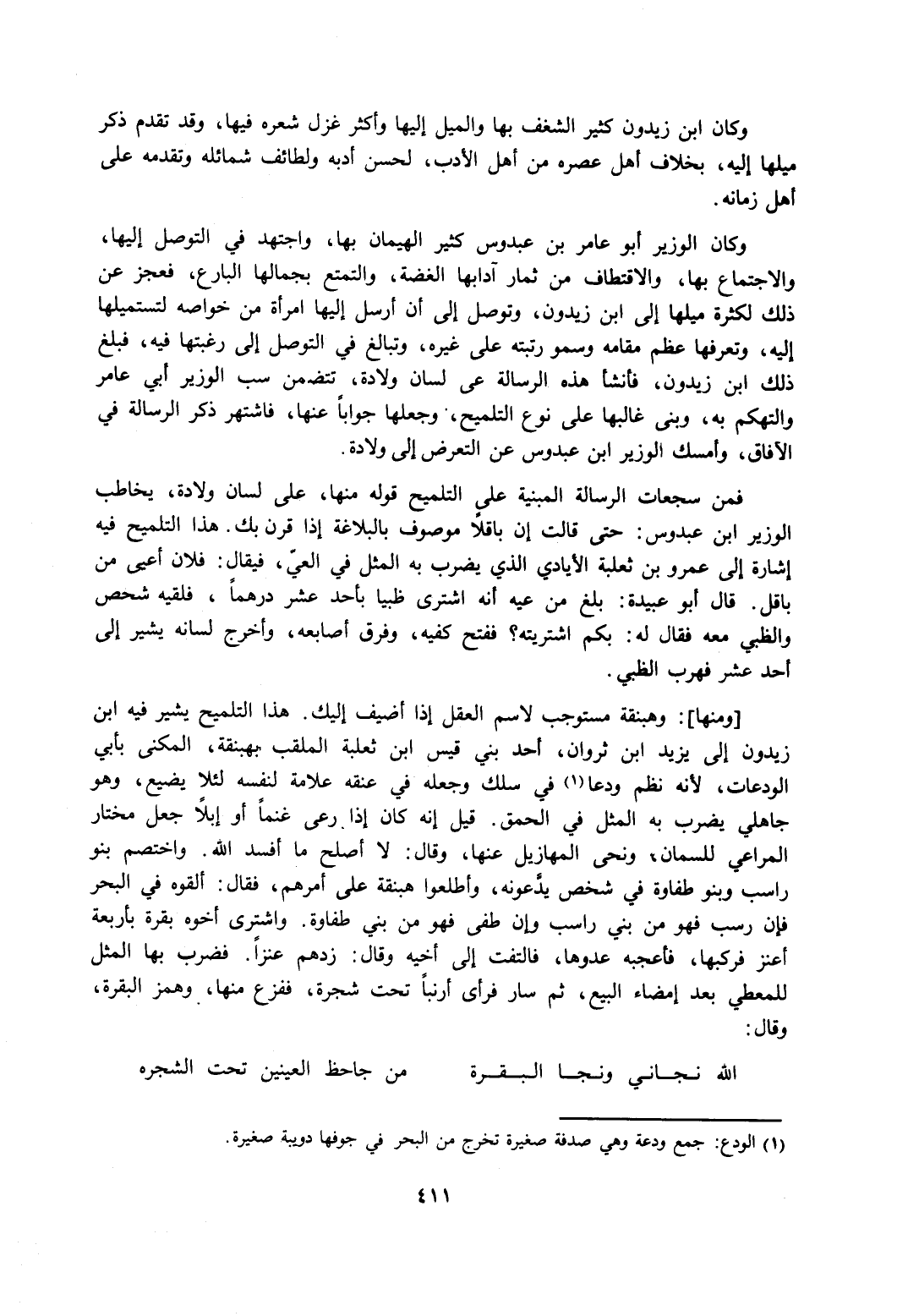 ومنها: وهبنقة مستوجب لاسم العقل إذا أضيف إليك. هذا التلميح يشير فيه ابن زيدون إلى يزيد بن ثروان، أحد بني قيس بن ثعلبة الملقب بهبنقة المكنى بأبي الودعات، لأنه نظم ودعا1 في سلك وجعله في عنقه علامة لنفسه لئلا يضيع، وهو جاهلي يضرب به المثل في الحمق. قيل إنه كان إذا رعى غنمًا أو إبلًا جعل مختار المراعي للسمان، ونحى المهازيل عنها، وقال: لا أصلح ما أفسد الله. واختصم بنو راسم وبنو طفاوة في شخص يدَّعونه، وأطلعوا هبنقة على أمرهم، فقال: ألقوه في البحر فإن رسب فهو من بني راسب وإن طفا فهو من بني طفاوة. واشترى أخوه بقرة بأربعة أعنز فركبها، فأعجبه عدوها، فالتفت إلى أخيه وقال: زدهم عنزًا، فضرب بها المثل للمعطي بعد إمضاء البيع، ثم سار فرأى أرنبًا تحت شجرة، ففزع منها، وهمز البقرة، وقال: