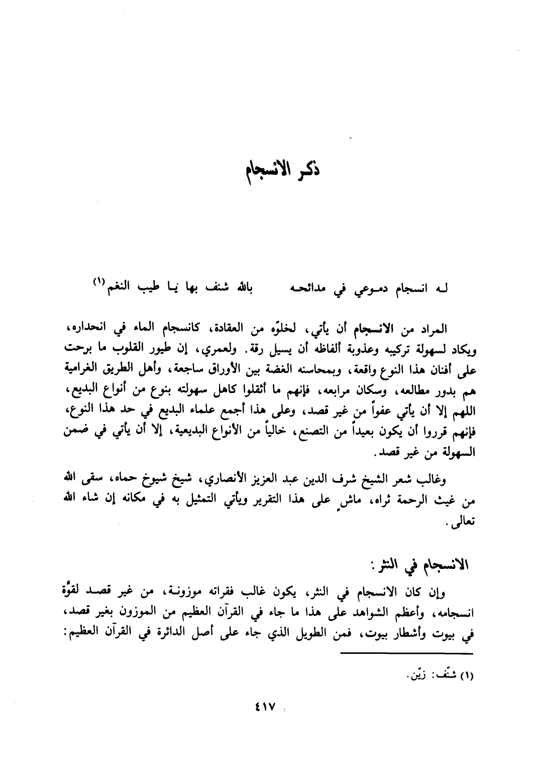 وغالب شعر الشيخ شرف الدين عبد العزيز الأنصاري، شيخ شيوخ حماه، سقى الله من غيث الرحمة ثراه، ماش على هذا التقرير ويأتي التمثيل به في مكانه إن شاء الله تعالى.