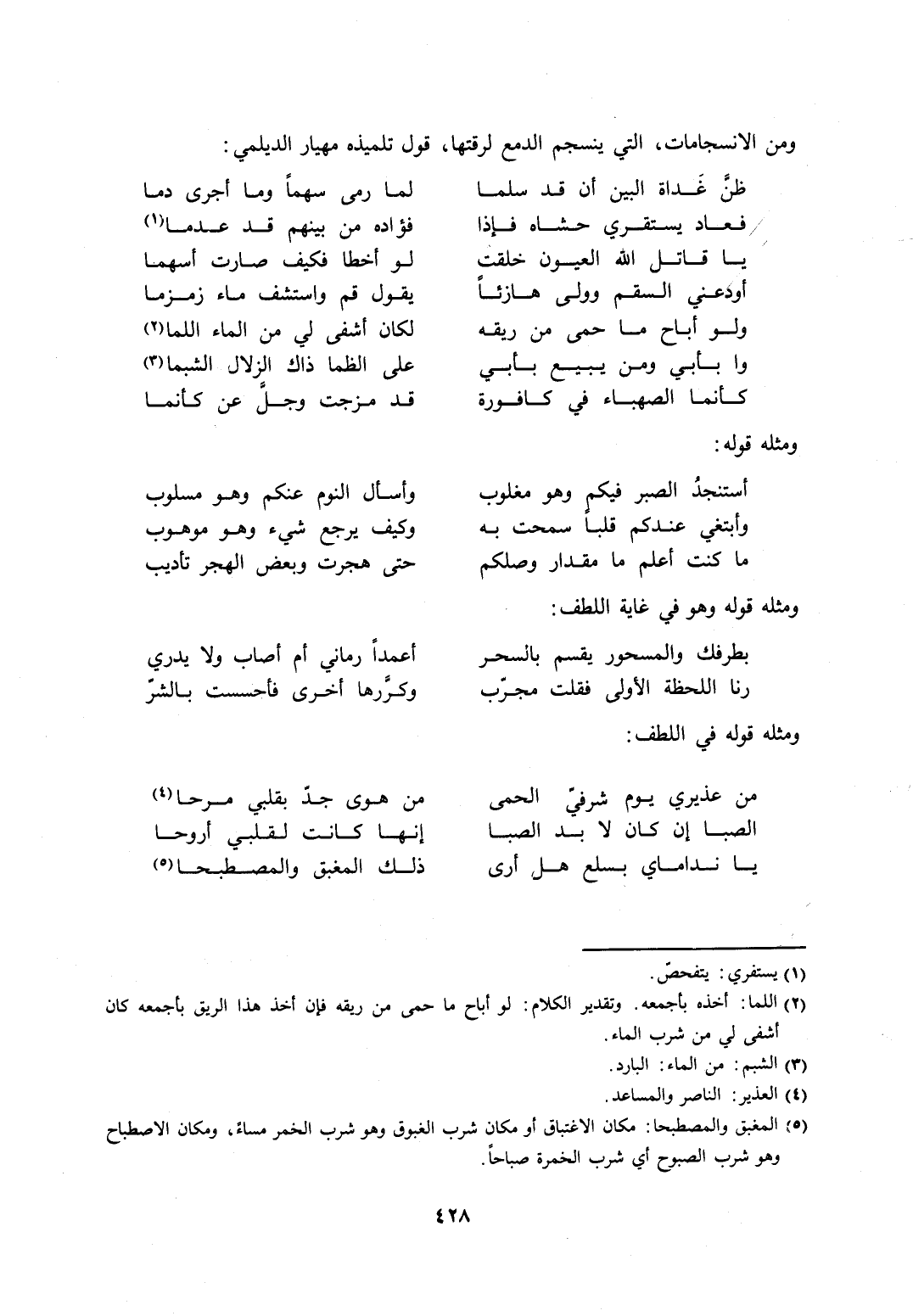 ومن الانسجامات، التي ينسجم الدمع لرقتها، قول تلميذه مهيار الديلمي: