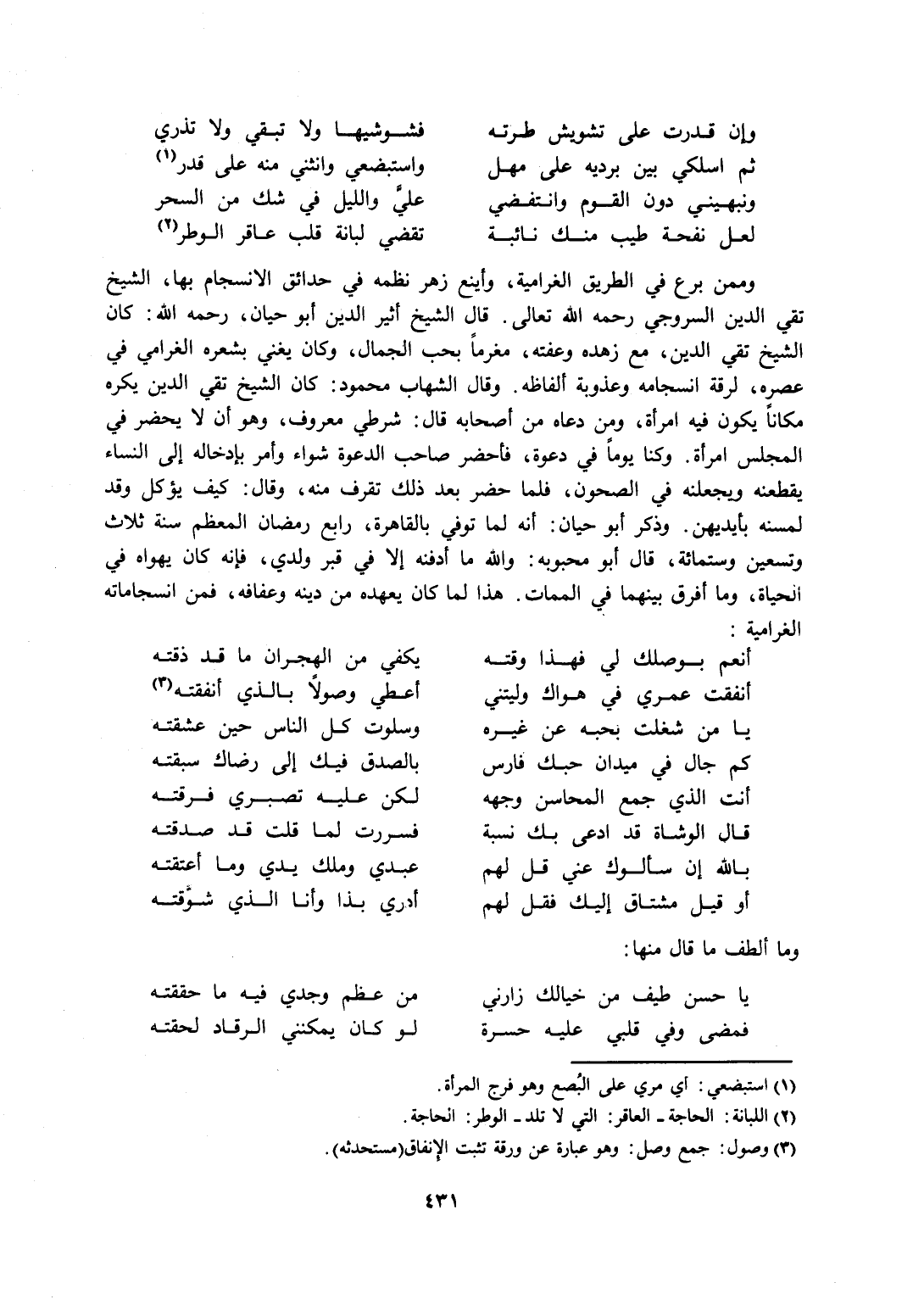 وممن برع في الطريق الغرامية، وأينع زهر نظمه في حدائق الانسجام بها، الشيخ تقي الدين السروجي رحمه الله تعالى. قال الشيخ أثير الدين أبو حيان، رحمه الله: كان الشيخ تقي الدين، مع زهده وعفته، مغرمًا بحب الجمال، وكان يغني بشعره الغرامي في عصره، لرقة انسجامه وعذوبة ألفاظه. وقال الشهاب محمود: كان الشيخ تقي الدين يكره مكانًا يكون فيه امرأة، ومن دعاه من أصحابه قال: شرطي معروف، وهو أن لا يحضر في المجلس امرأة. وكنا يومًا في دعوة، فأحضر صاحب الدعوة شواء وأمر بإدخاله إلى النساء يقطعنه ويجعلنه في الصحون، فلما حضر بعد ذلك تقرف منه، وقال: كيف يؤكل وقد لمسنه بأيديهن. وذكر أبو حيان: أنه لما توفي بالقاهرة، رابع رمضان المعظم سنة ثلاث وتسعين وستمائة، قال أبو محبوبه: والله ما أدفنه إلا في قبر ولدي، فإنه كان يهواه في الحياة، وما أفرق بينهما في الممات. هذا لما كان يعهده من دينه وعفافه، فمن اسنجاماته الغرامية: