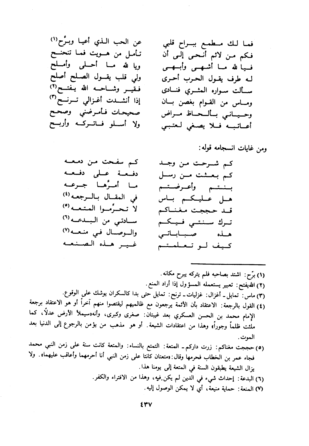 5 حجبت مغناكم: زرت داركم - المتعة: التمتع بالنساء: والمتعة كانت سنة على زمن النبي محمد صلى الله عليه وسلم فجاء عمر بن الخطاب فحرمها وقال: "متعتان كانتا زمن النبي أنا أحرمهما وأعاقب عليهما". ولا يزال الشيعة يطبقون السنة في المتعة إلى يومنا هذا.