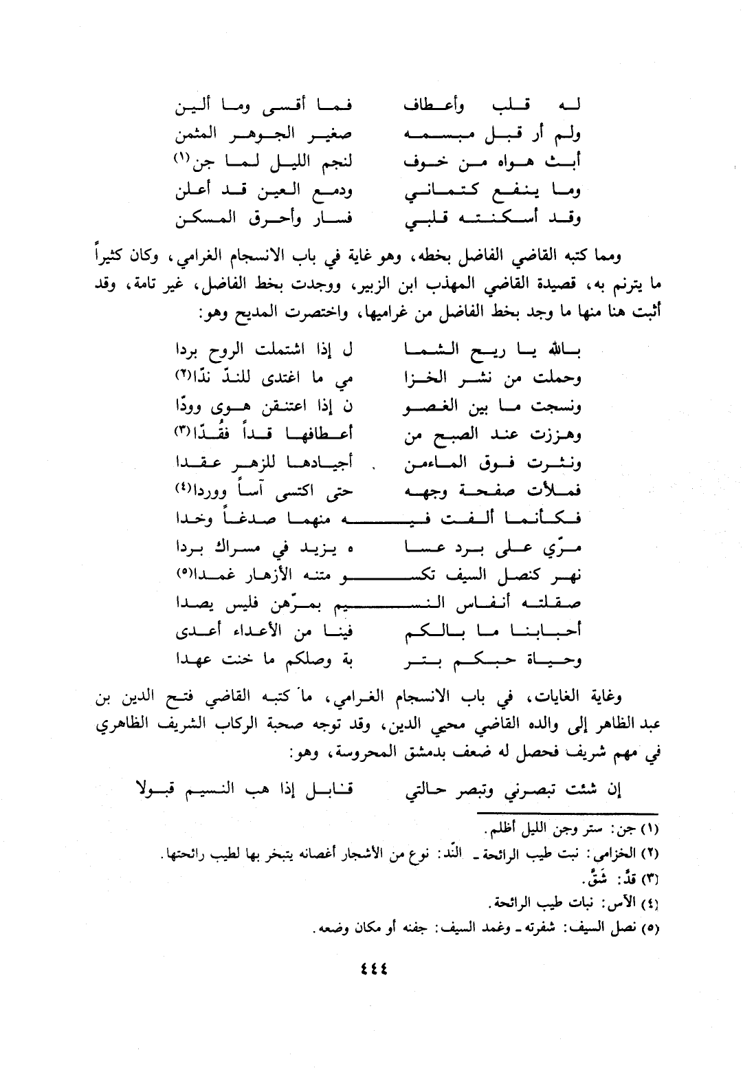 وغاية الغايات، في باب الانسجام الغرامي، ما كتبه القاضي فتح الدين بن عبد الظاهر إلى والده القاضي محي الدين، وقد توجه صحبة الركاب الشريف الظاهري في مهم شريف فحصل له ضعف بدمشق المحروسة، وهو: