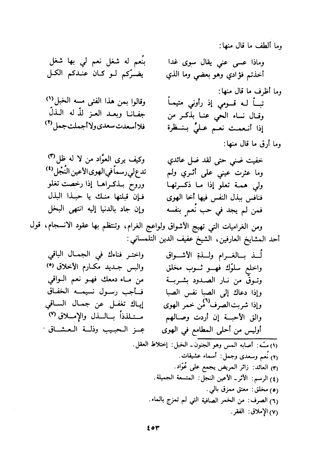 ومن الغراميات التي تهيج الأشواق ولواعج الغرام، وتنتظم بها عقود الانسجام، قول أحد المشايخ العارفين، الشيخ عفيف الدين التلمساني: