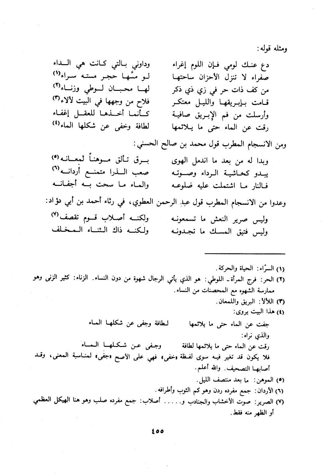 وعدوا من الانسجام المطرب قول عبد الرحمن العطوي، في رثاء أحمد بن أبي دؤاد: